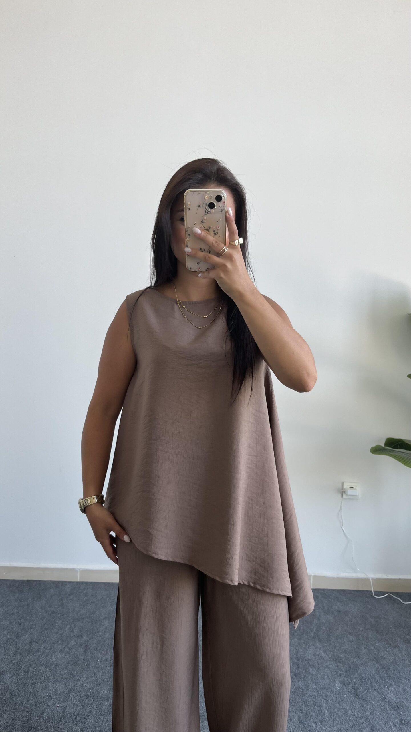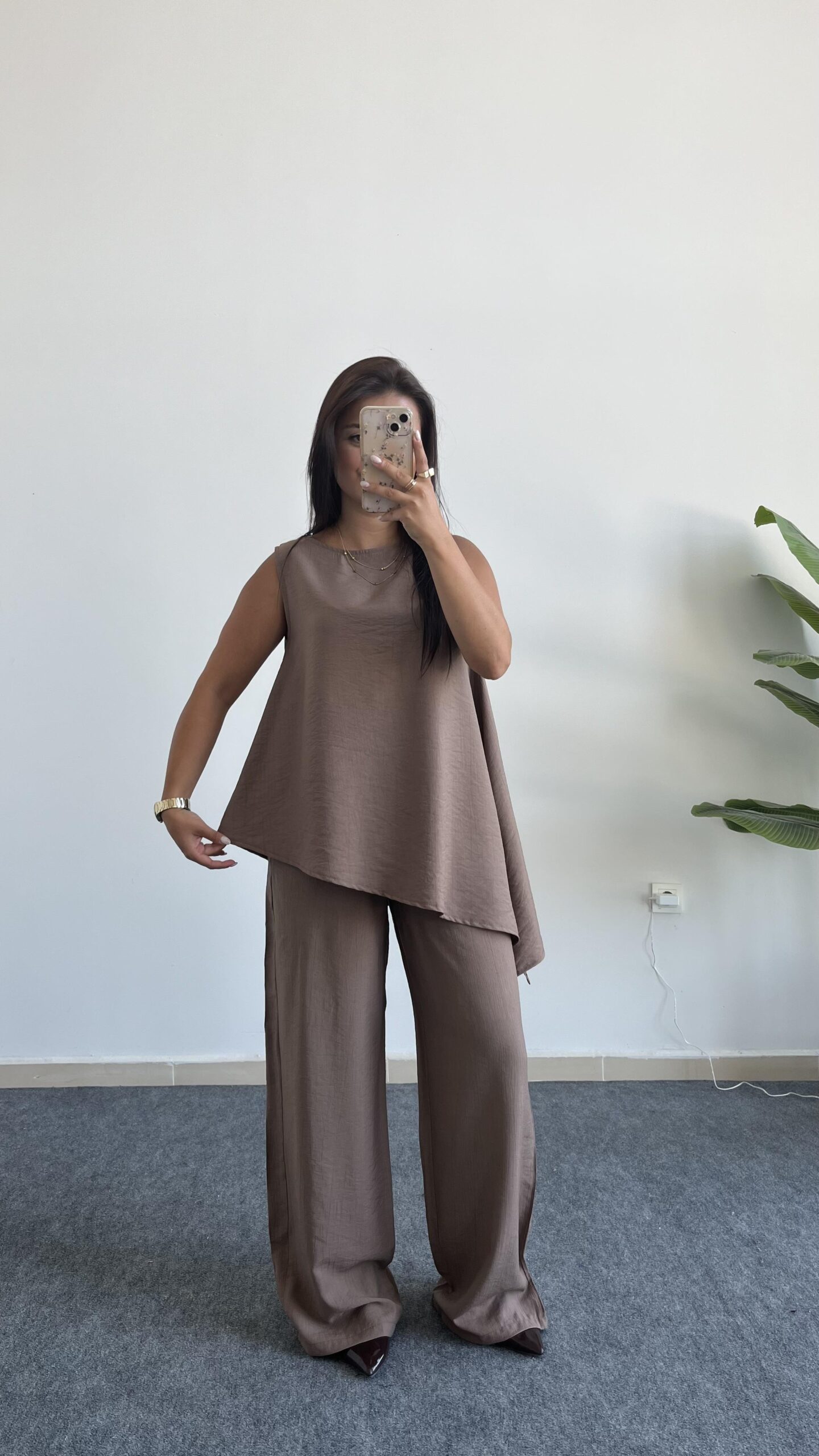 Asimetrik Kesim Bluz Pantolon Takım – Kahve