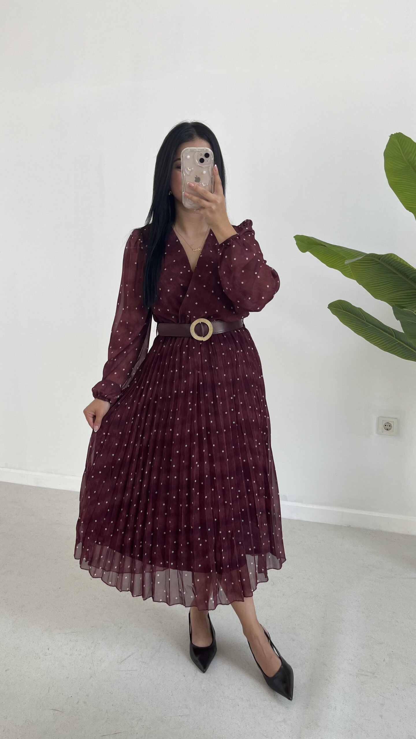 Kruvaze Kemerli Şifon Midi Elbise – Bordo