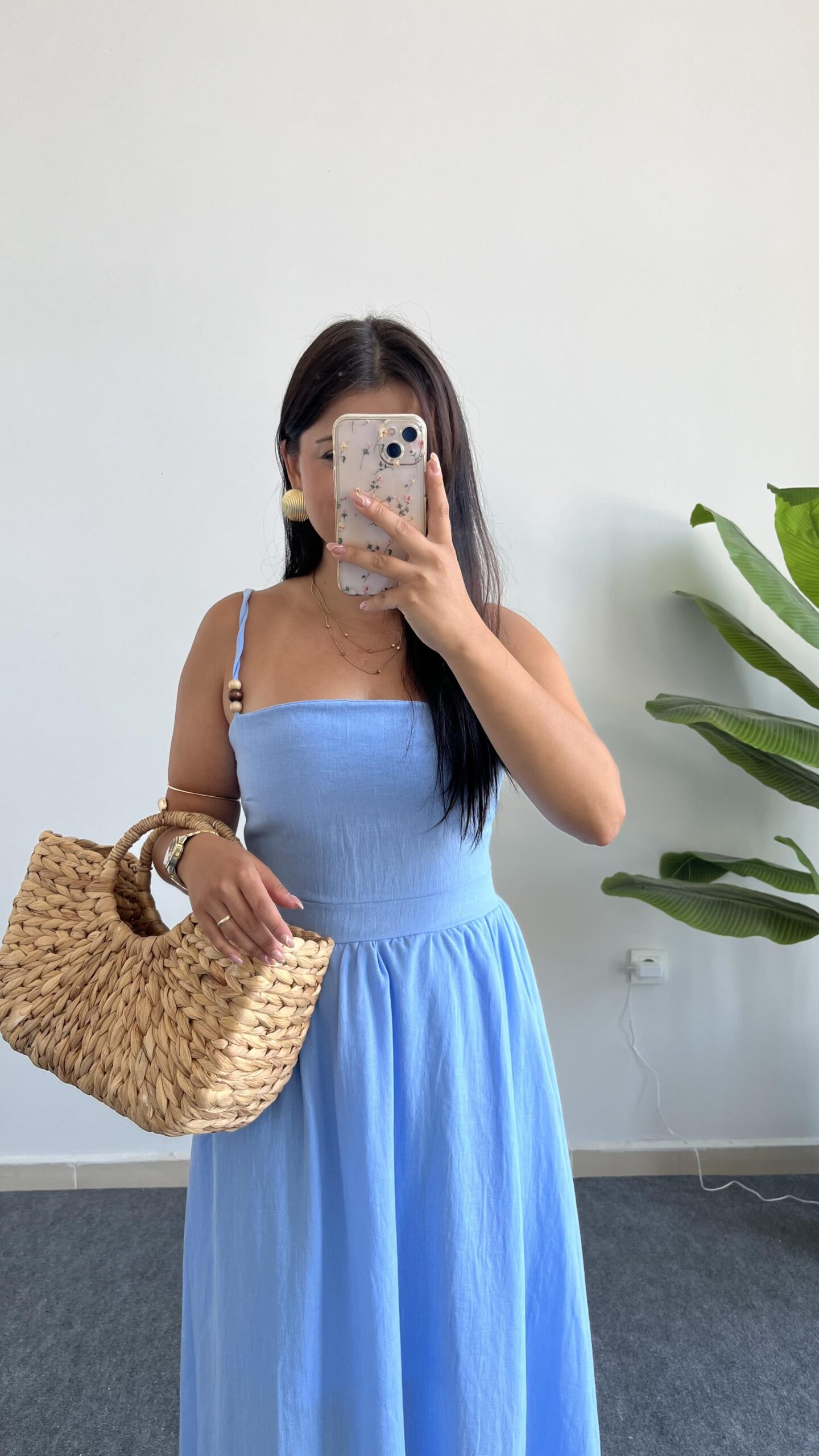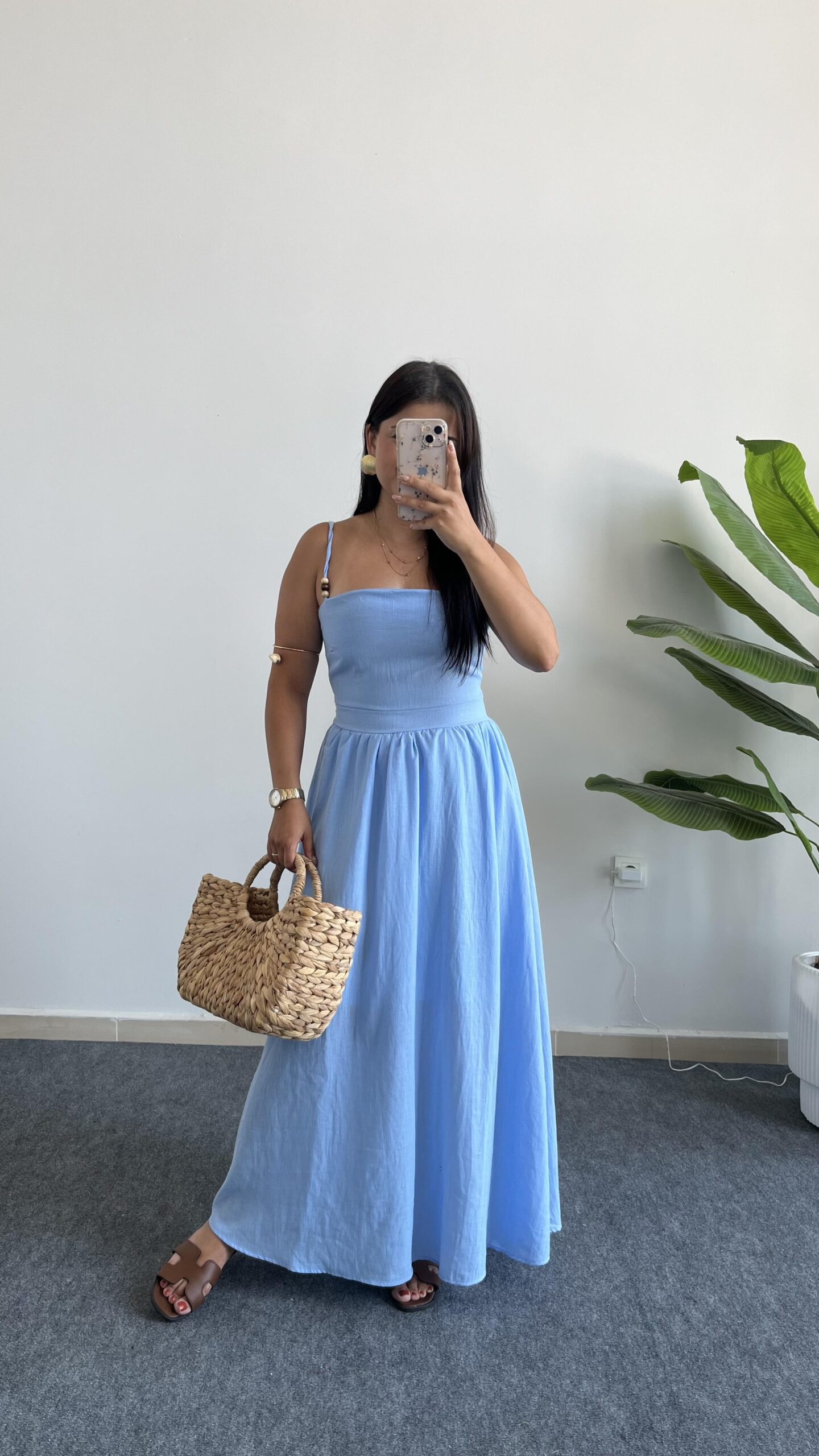 Olesa Sırtı Bağlamalı Keten Elbise – Bebe Mavi