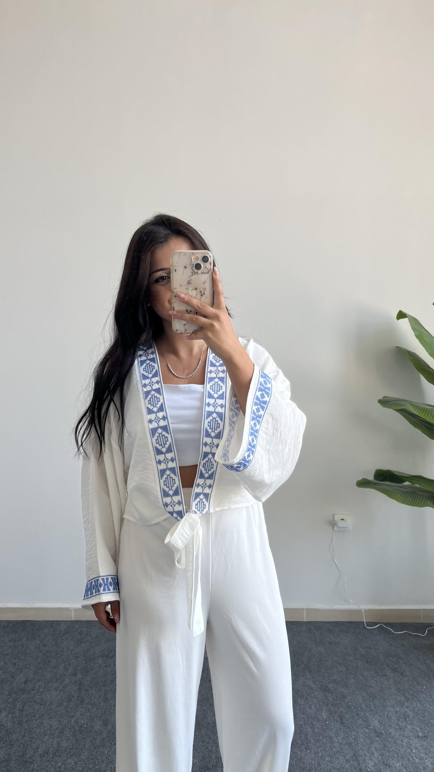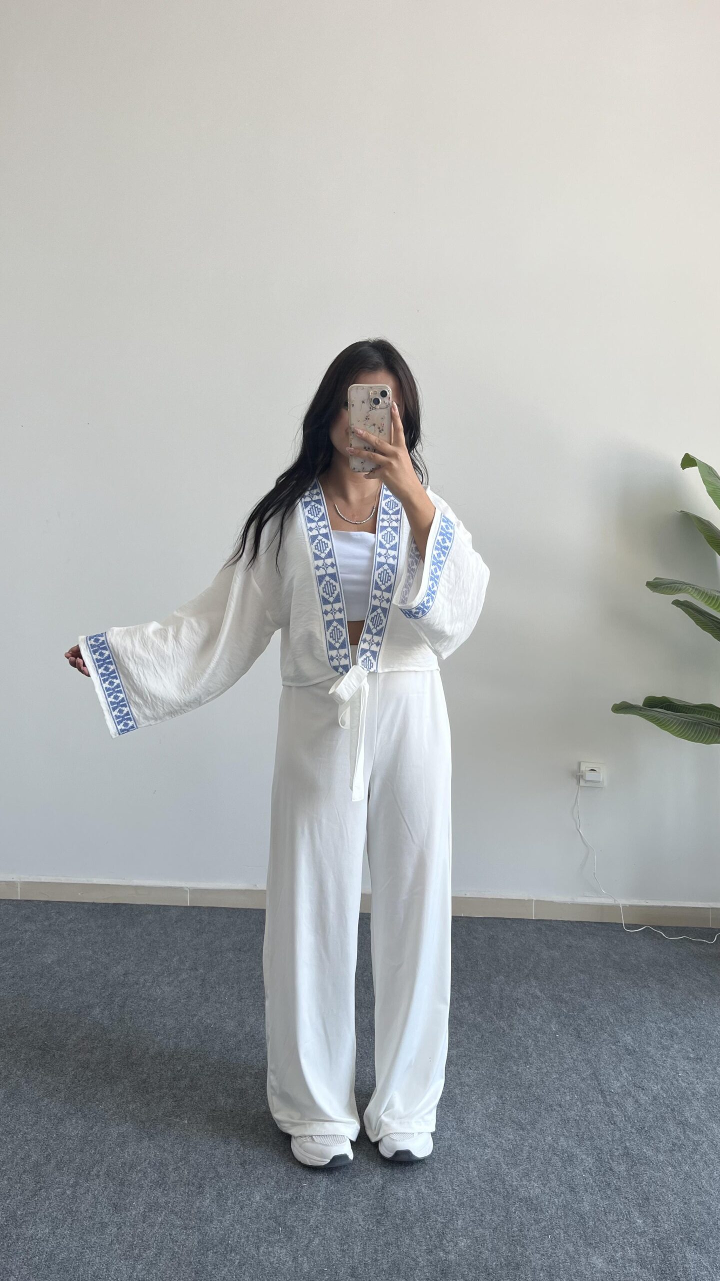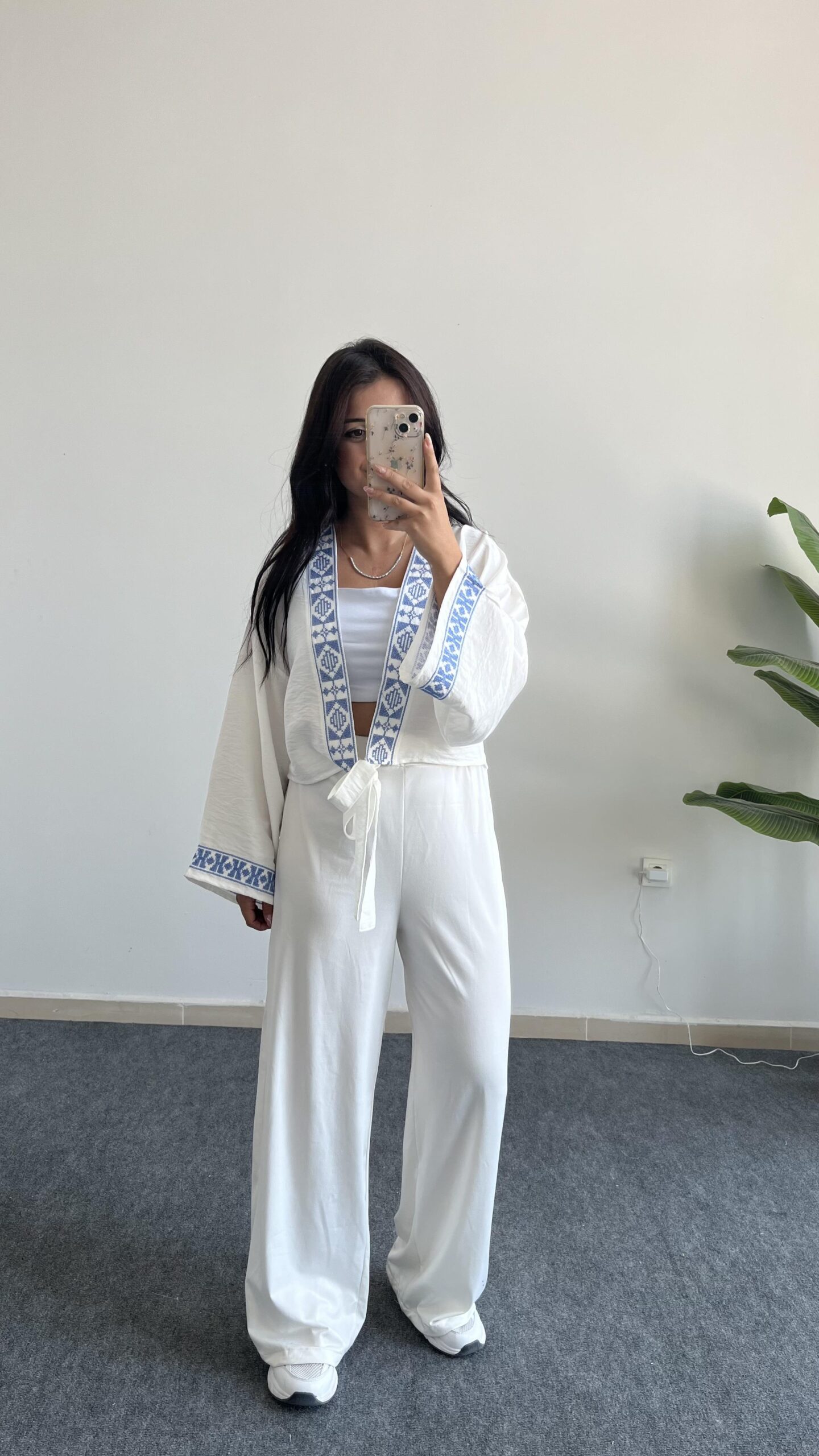 Tiris Nakışlı Kimono Bluz – Beyaz