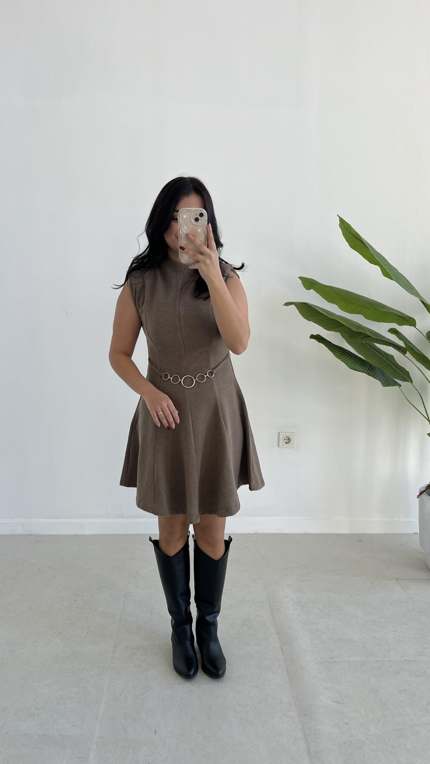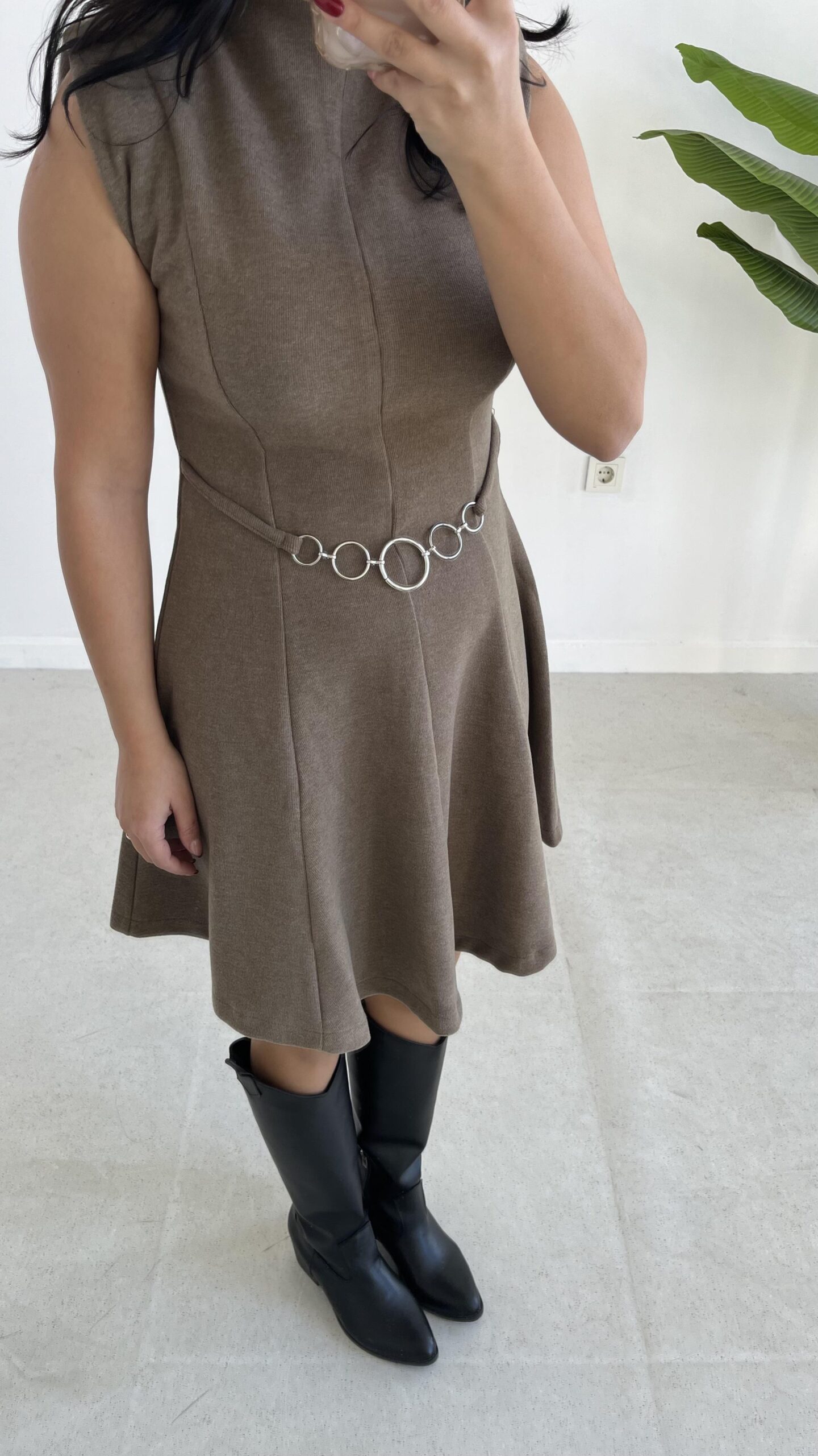 Zincir Aksesuarlı Vatkalı Selanik Elbise - Kahve