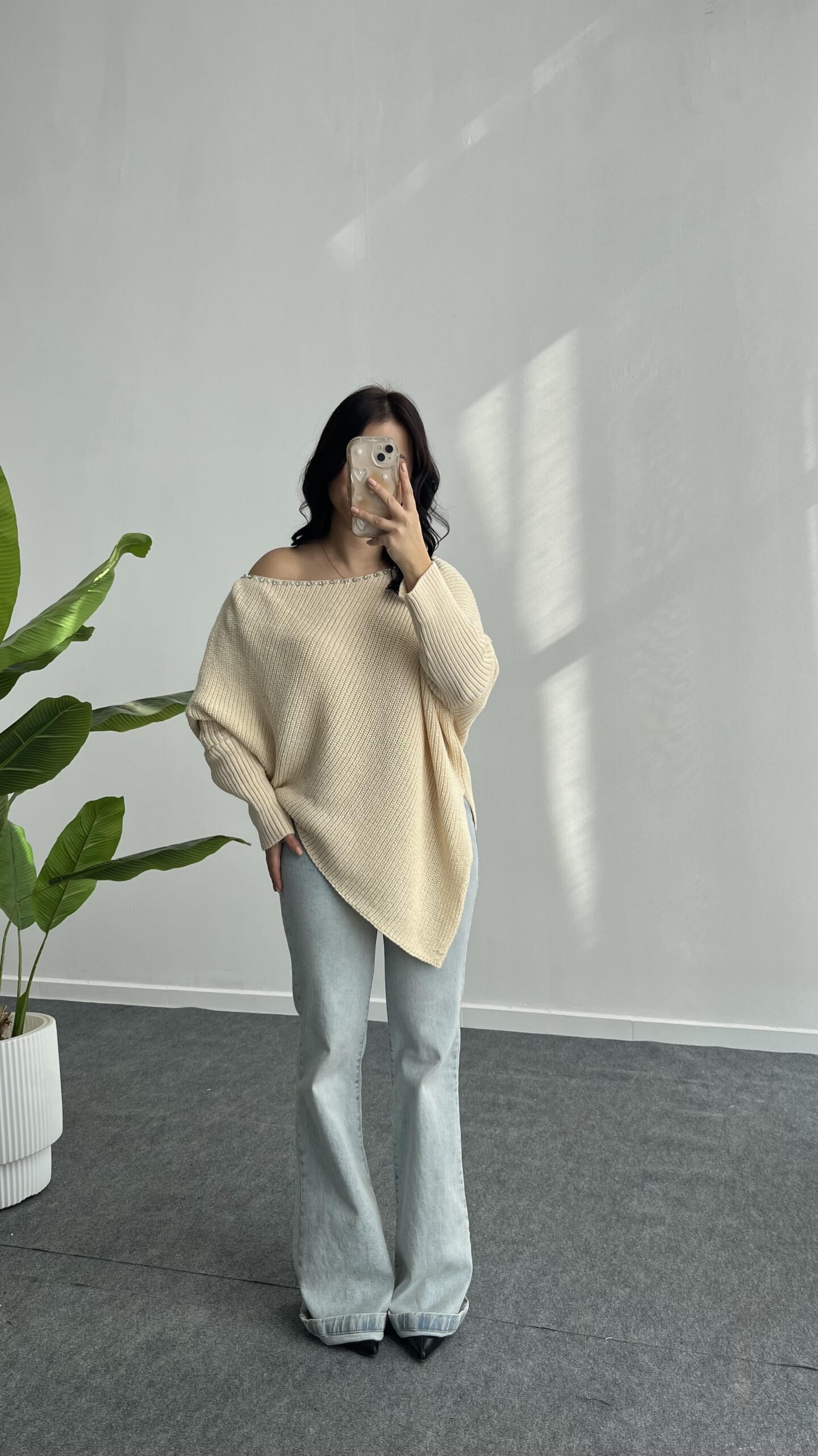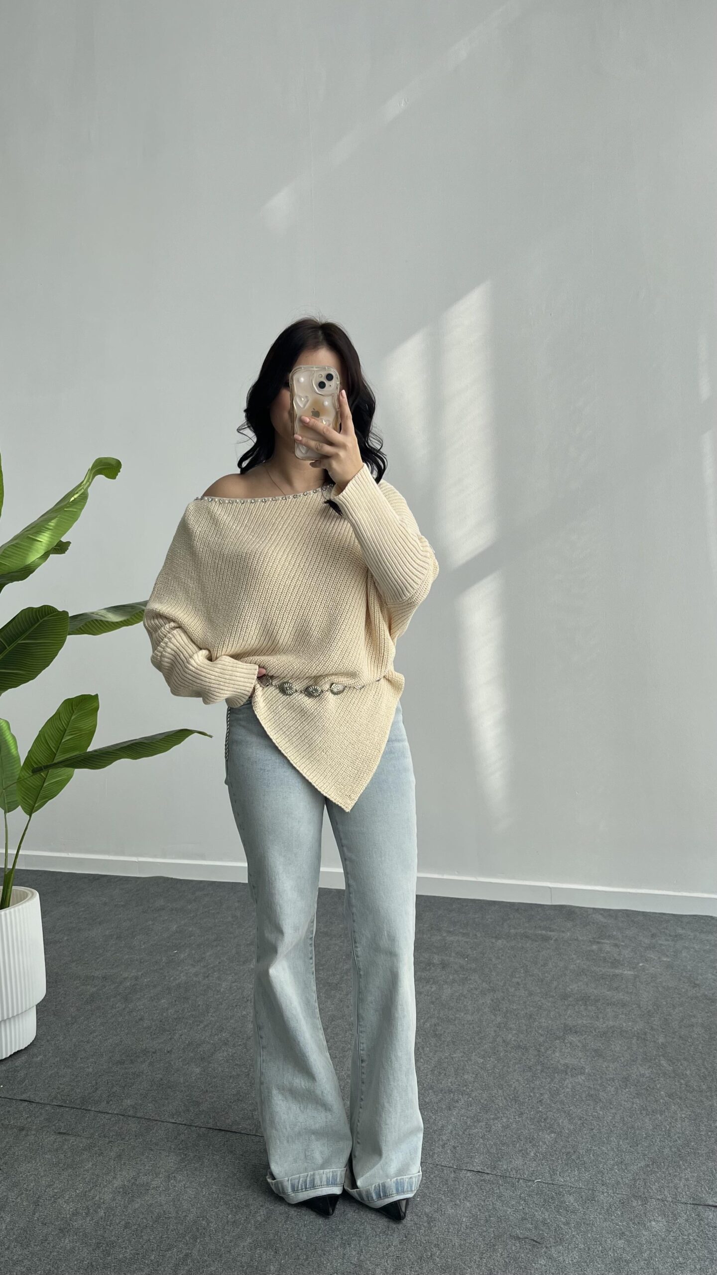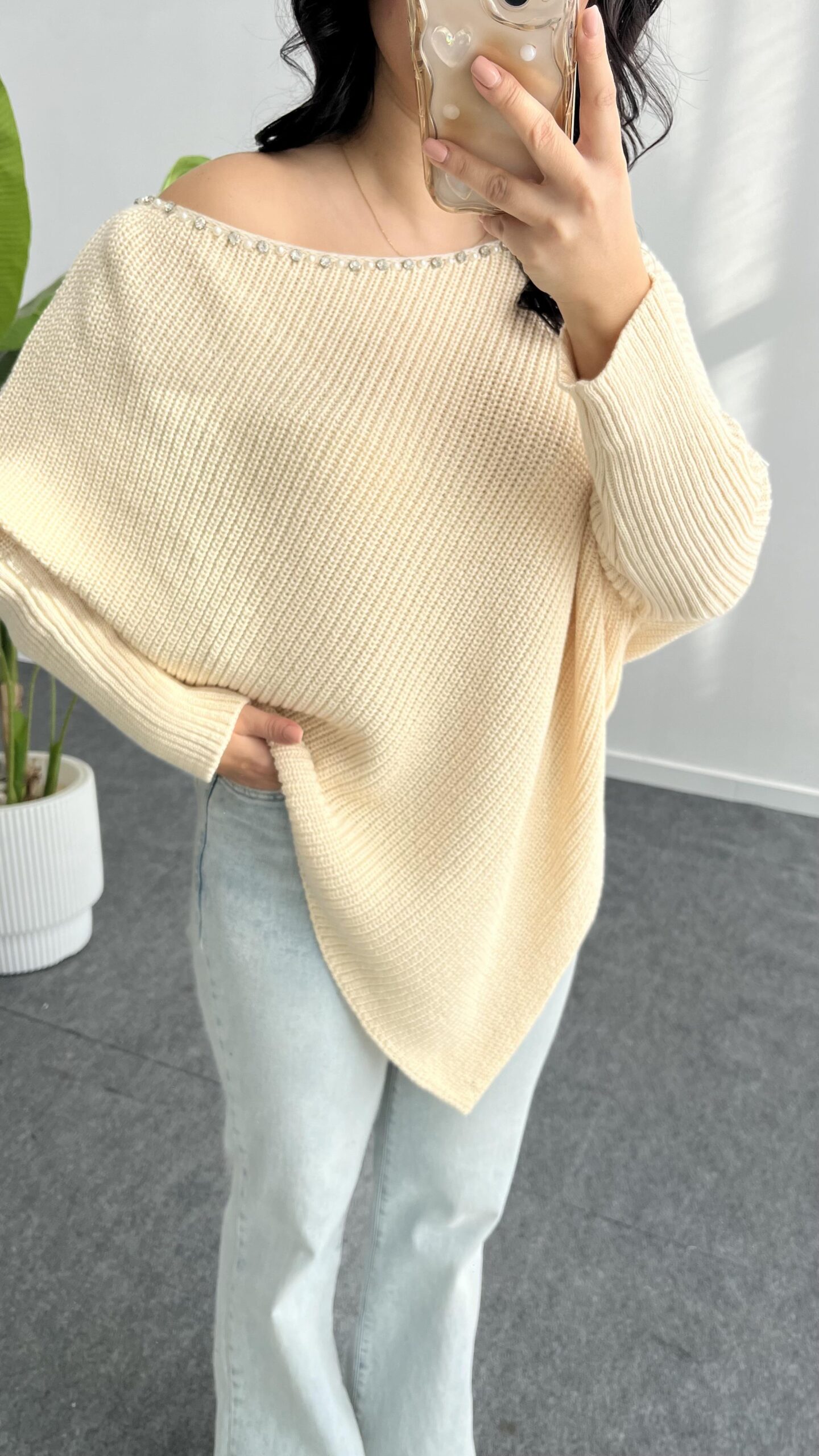 Yakası Taşlı Asimetrik Triko Bluz – Krem