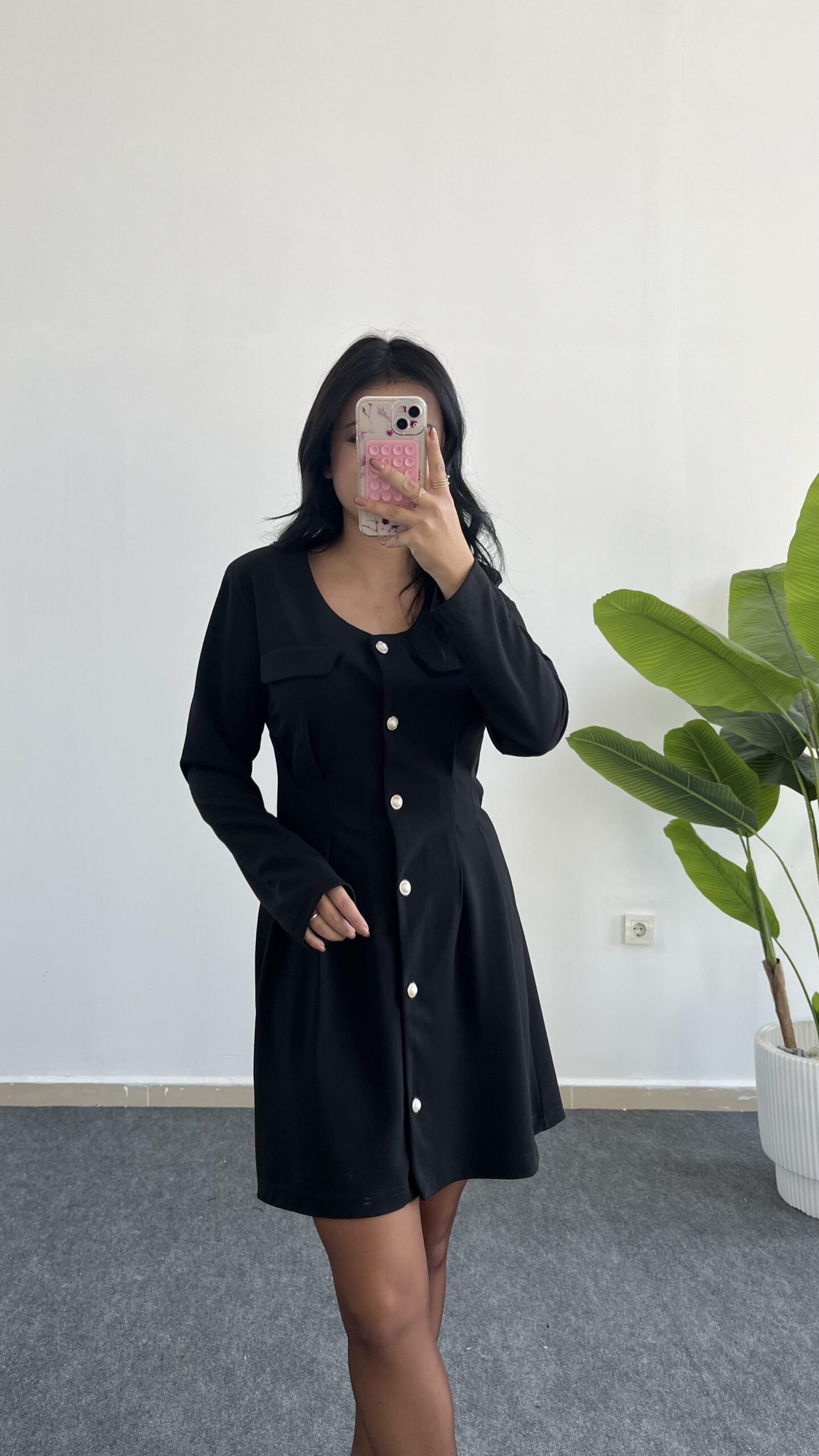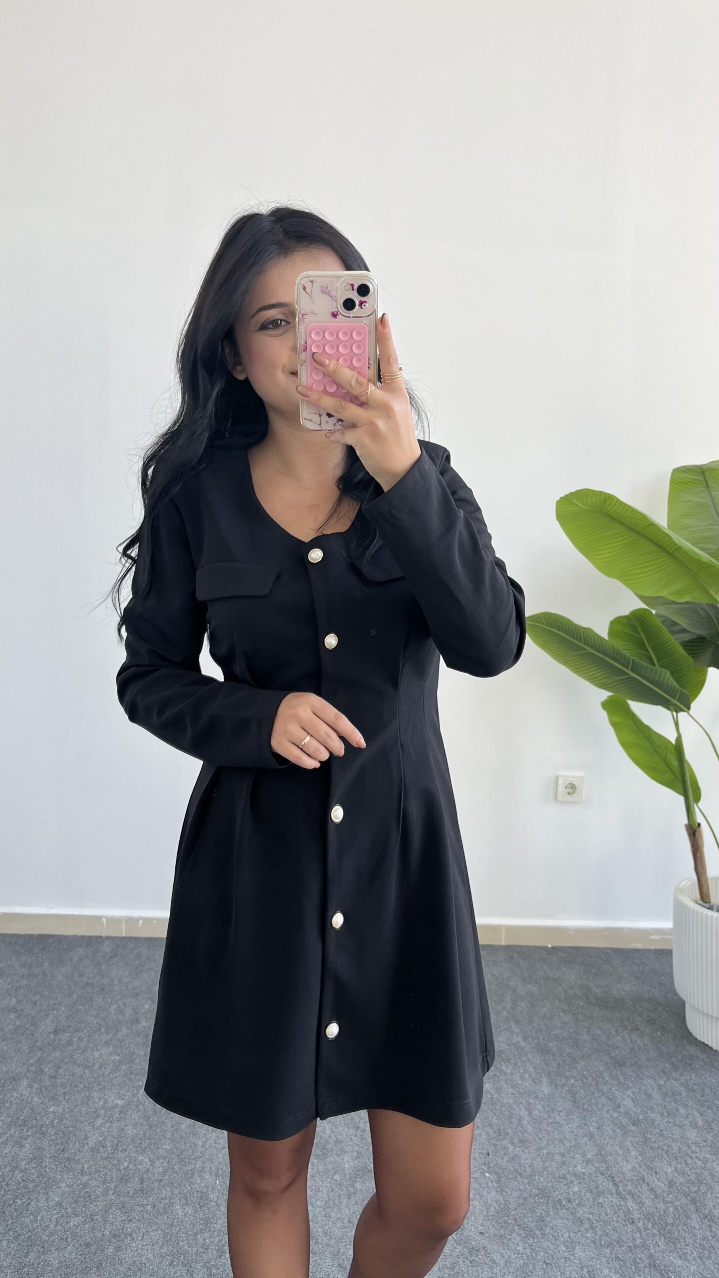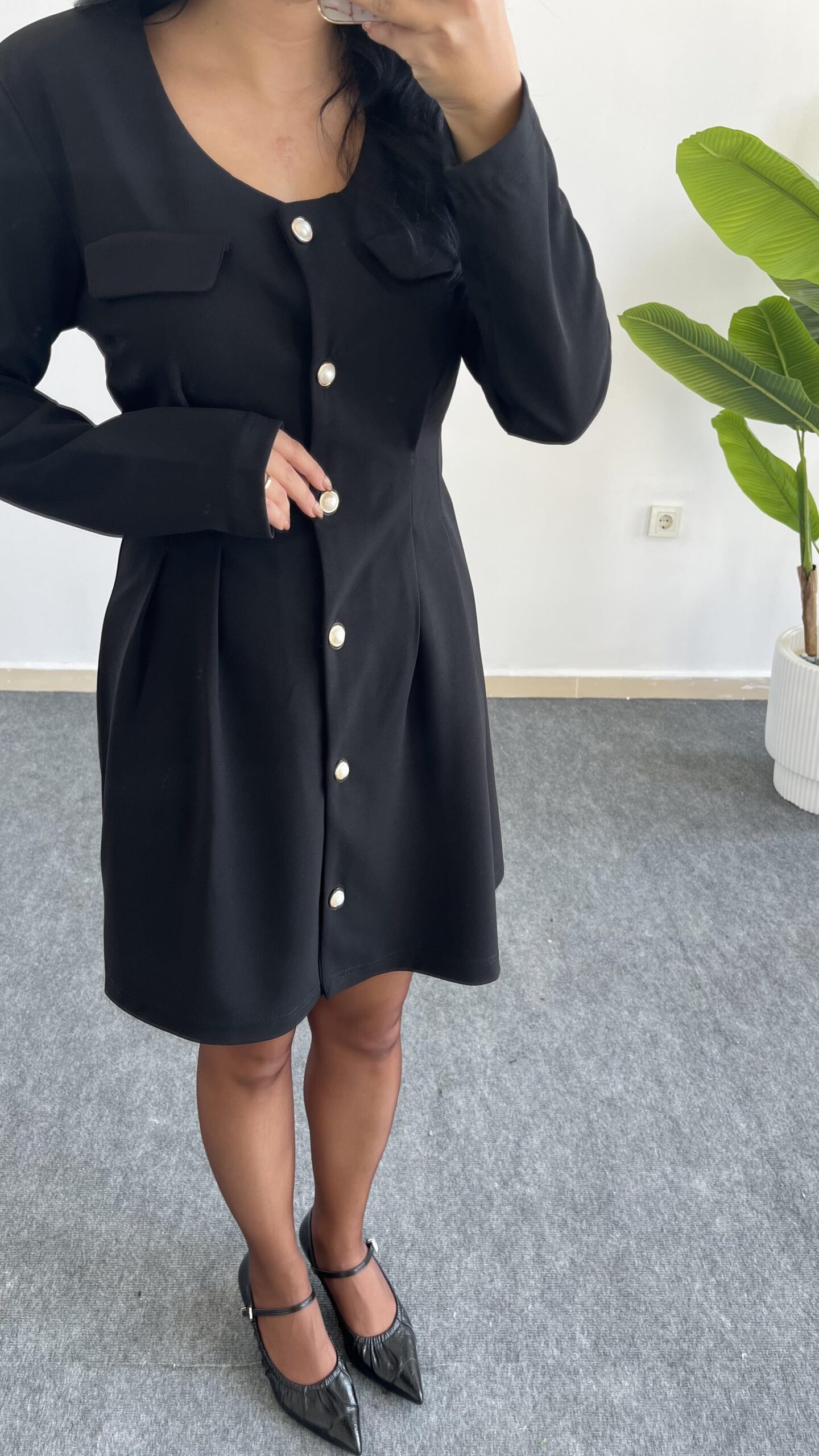 İnci Düğmeli Kapalı Cep Elbise