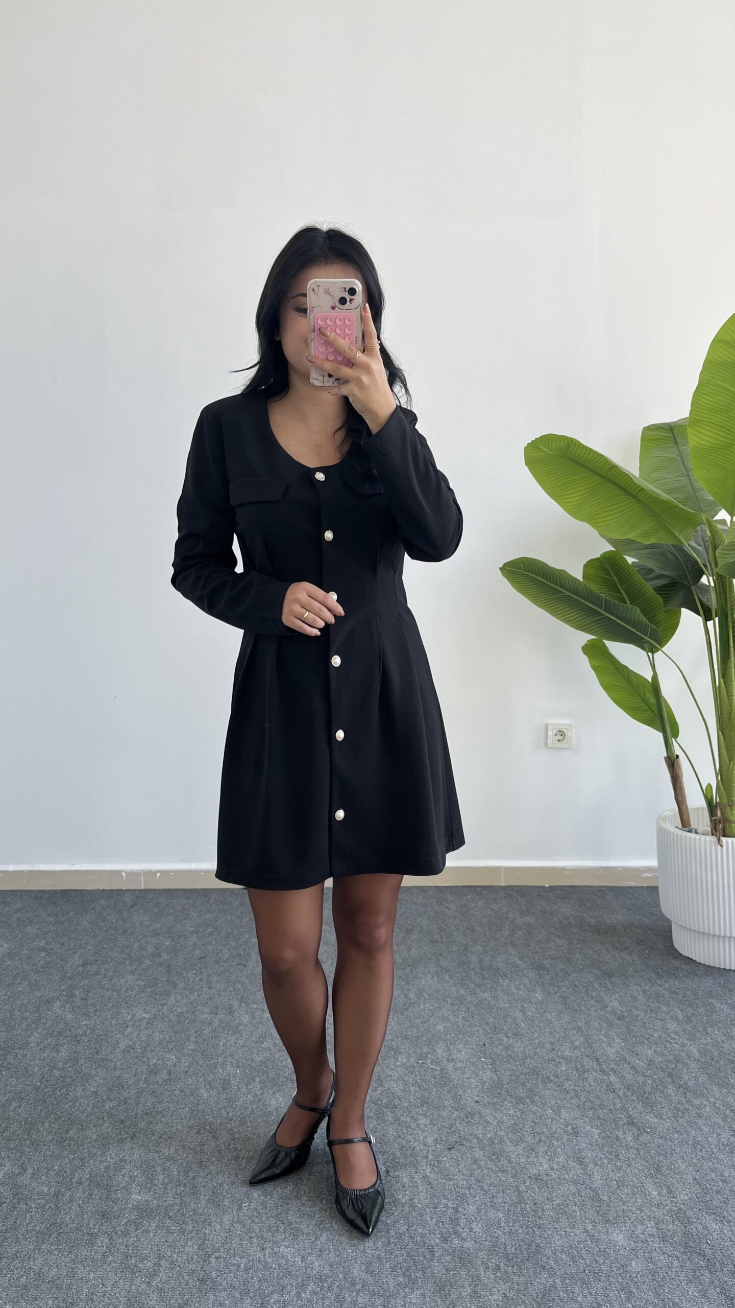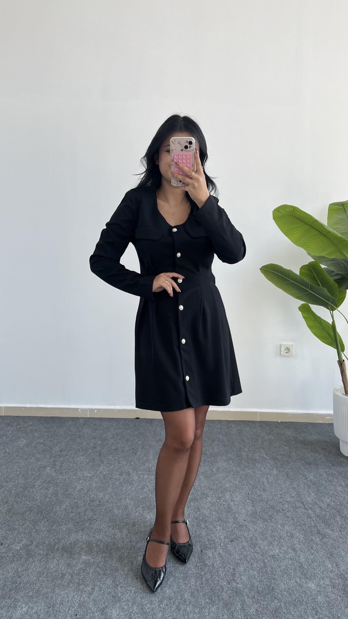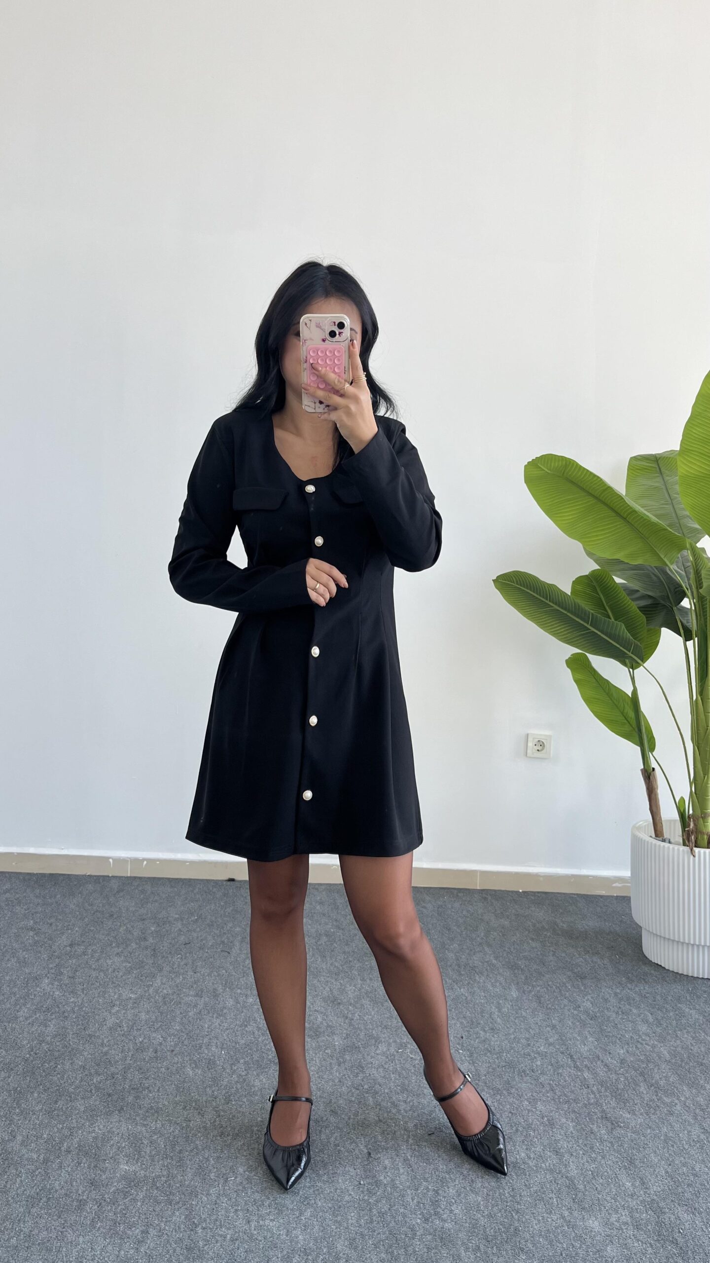 İnci Düğmeli Kapalı Cep Elbise