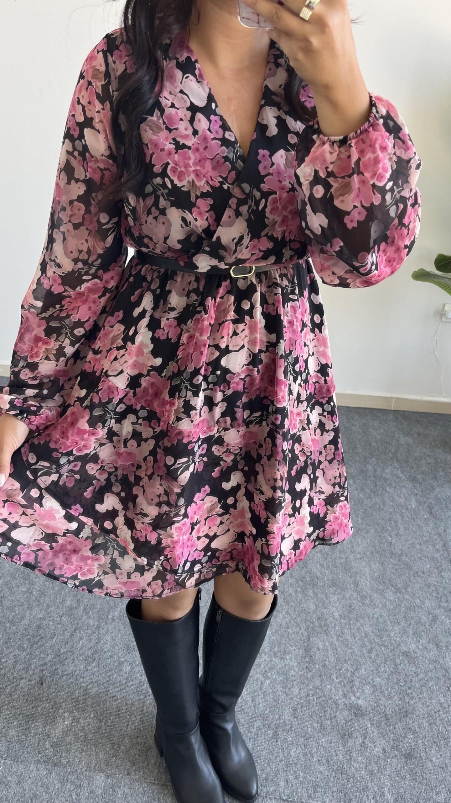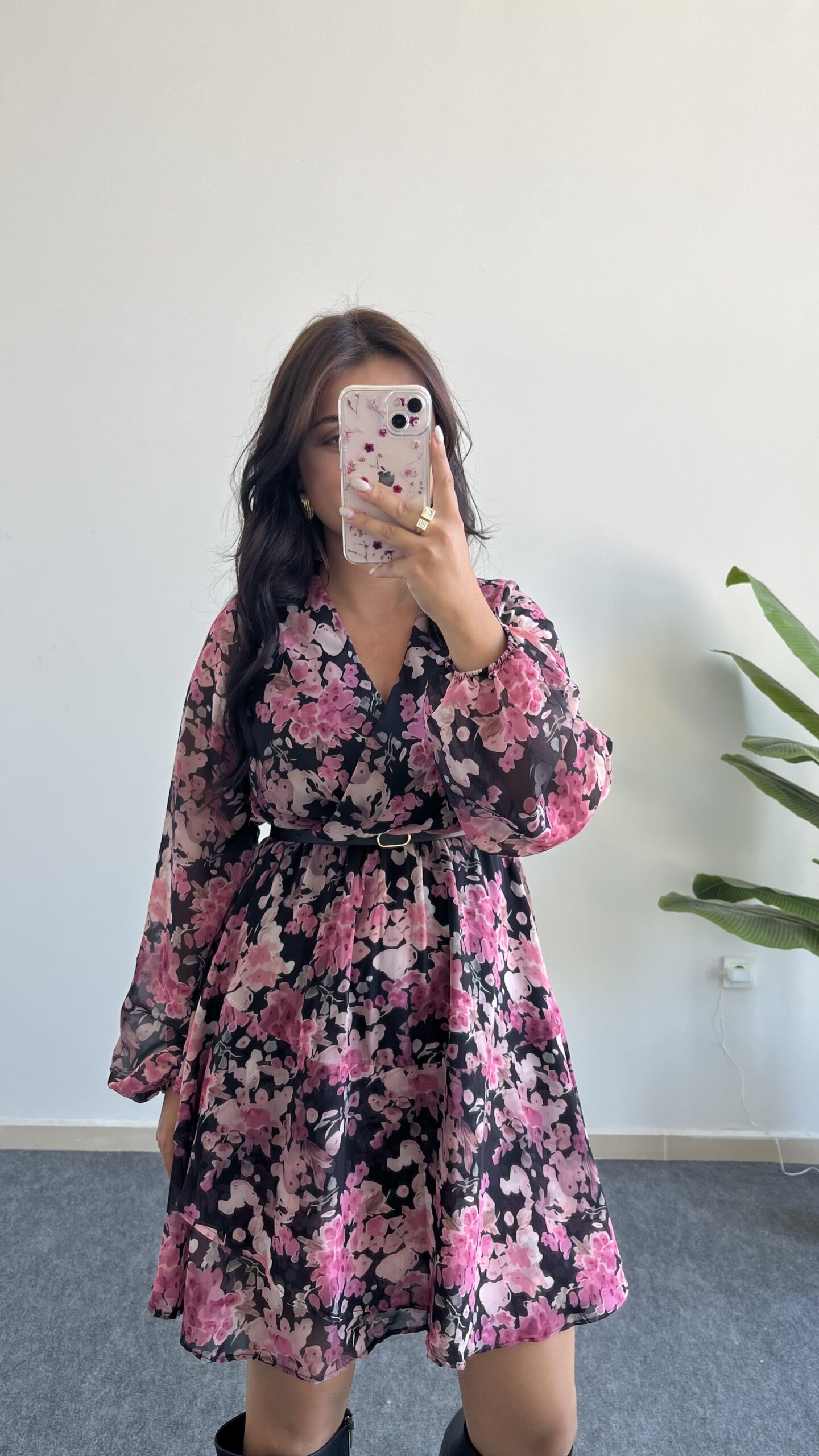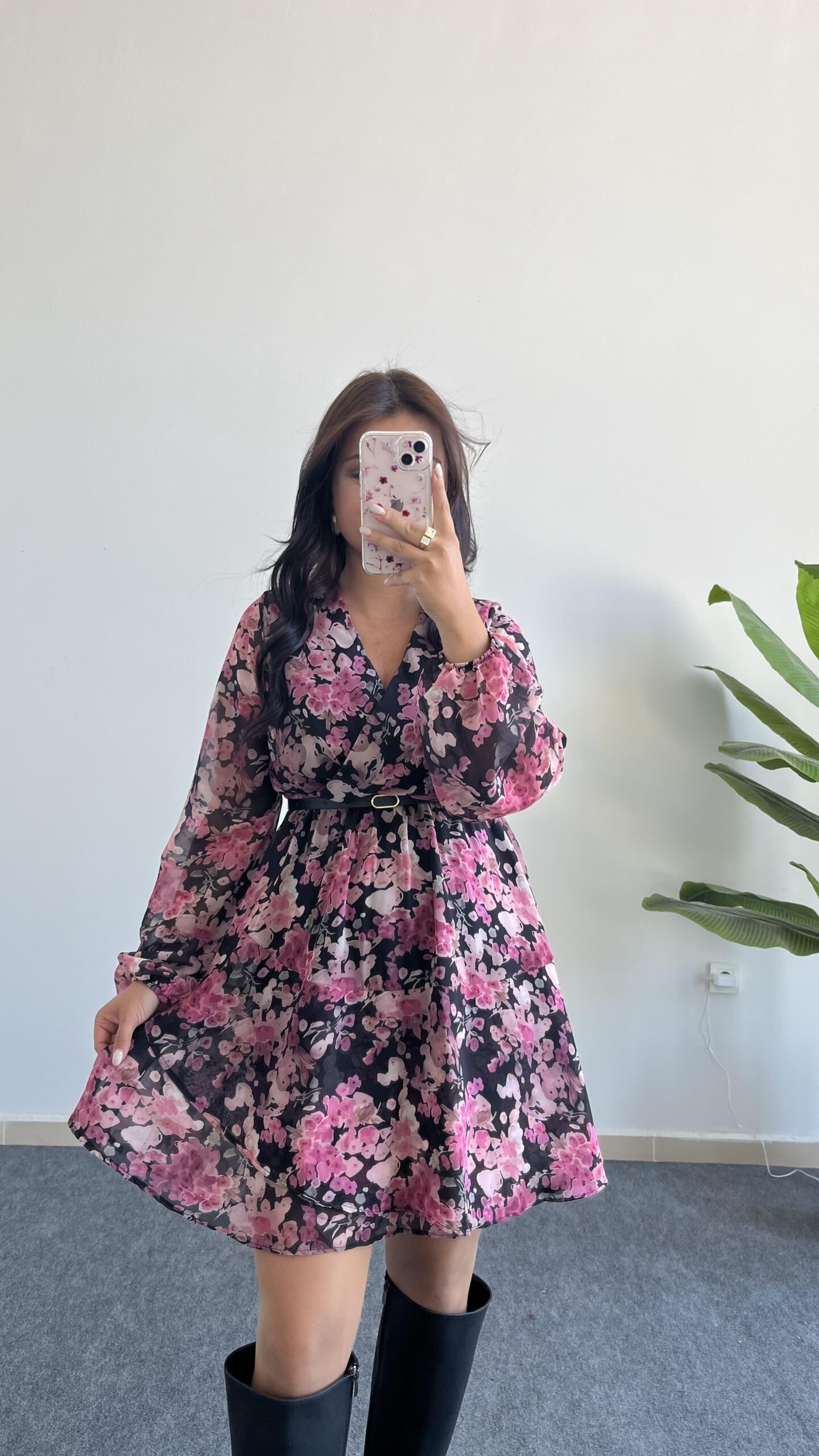 Kemerli Kruvaze Yaka Çiçekli Şifon Elbise – Pembe
