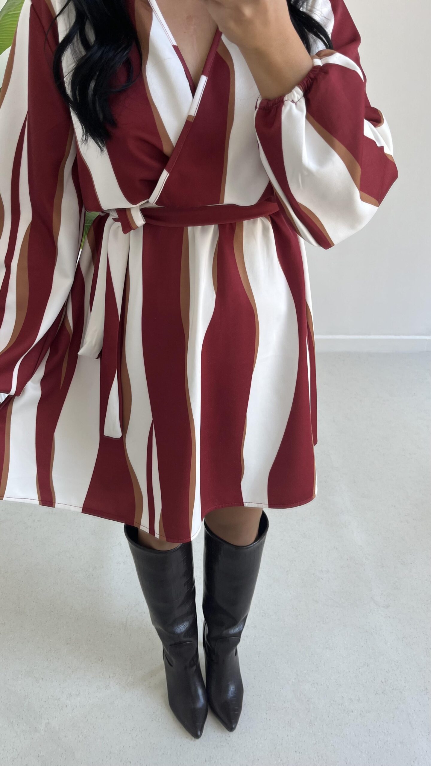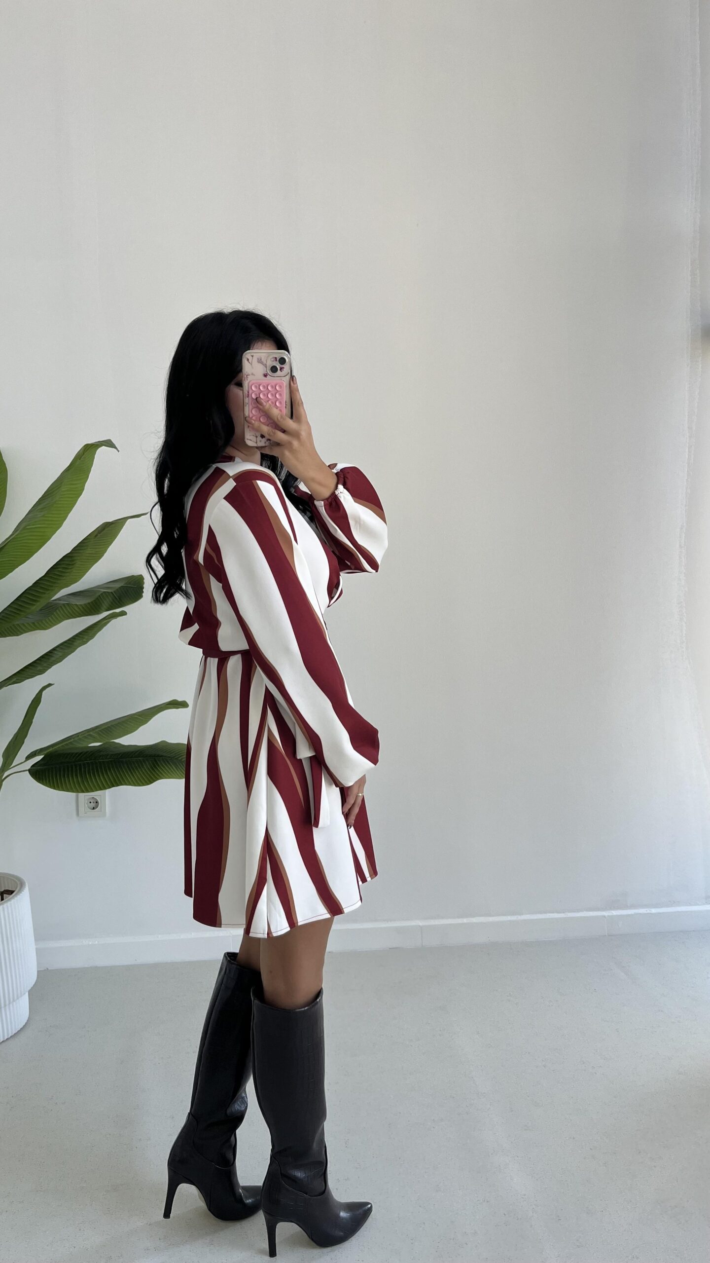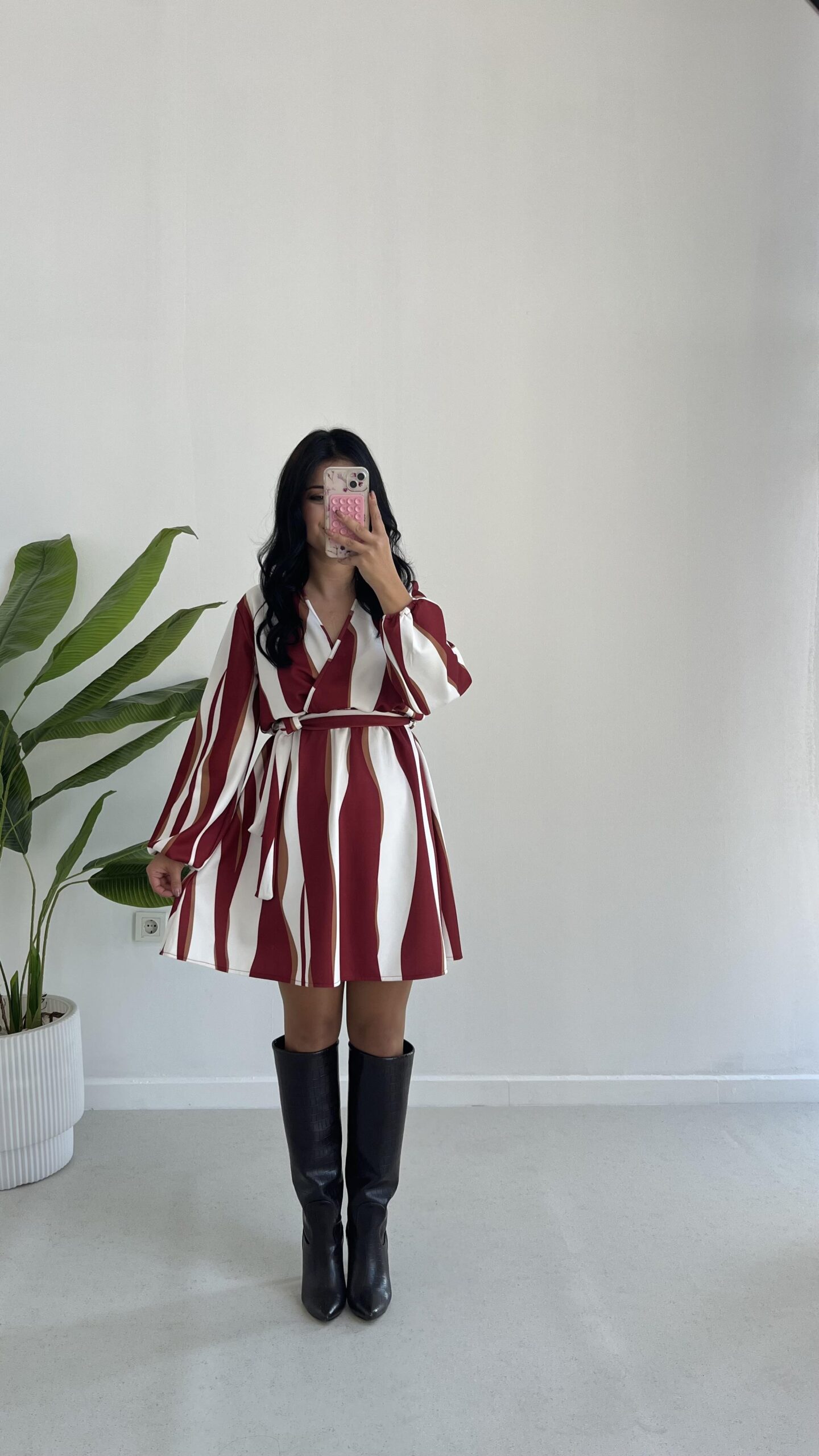 Kruvaze Yakalı Desenli Modal Mini Elbise – Bordo
