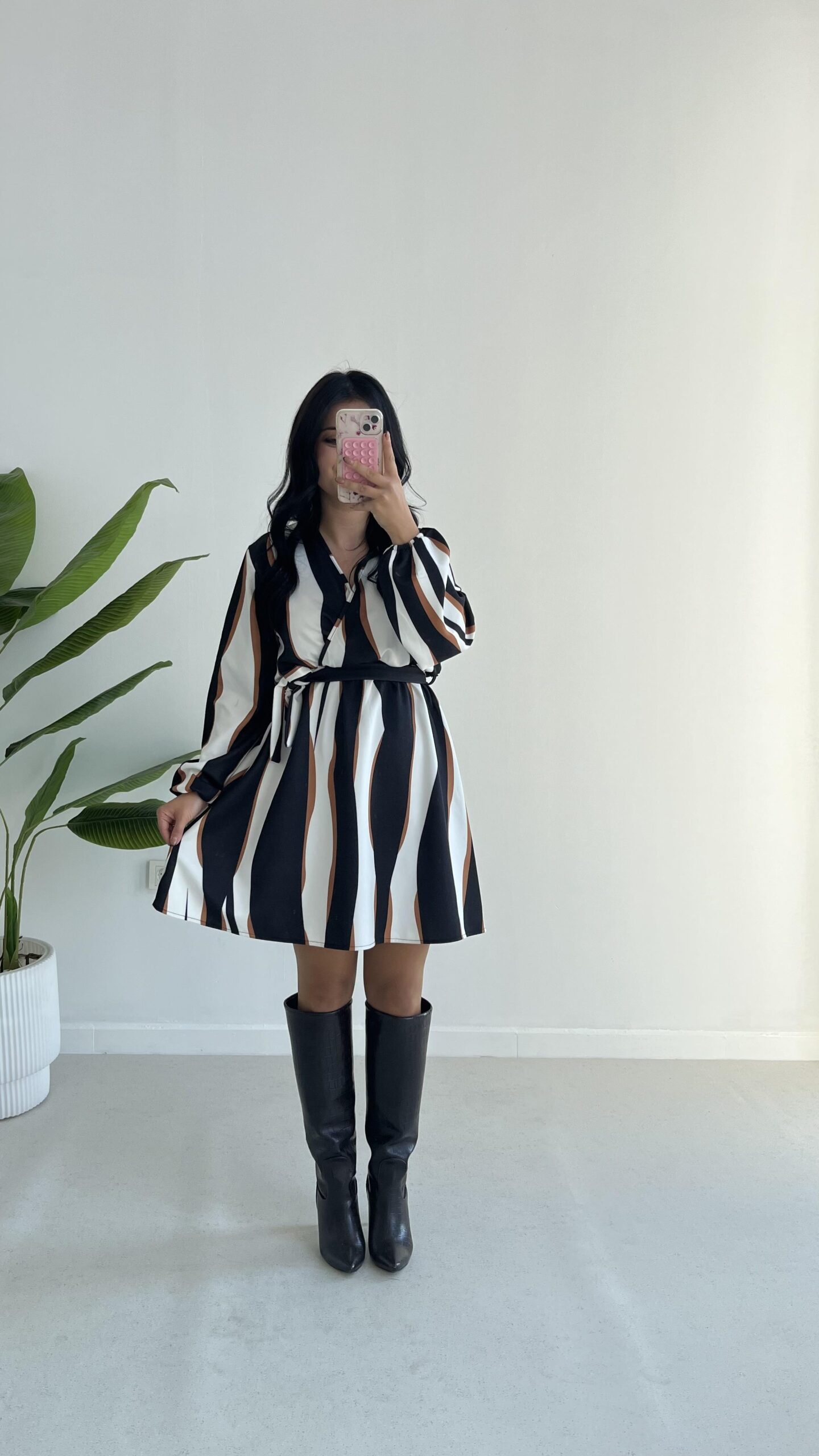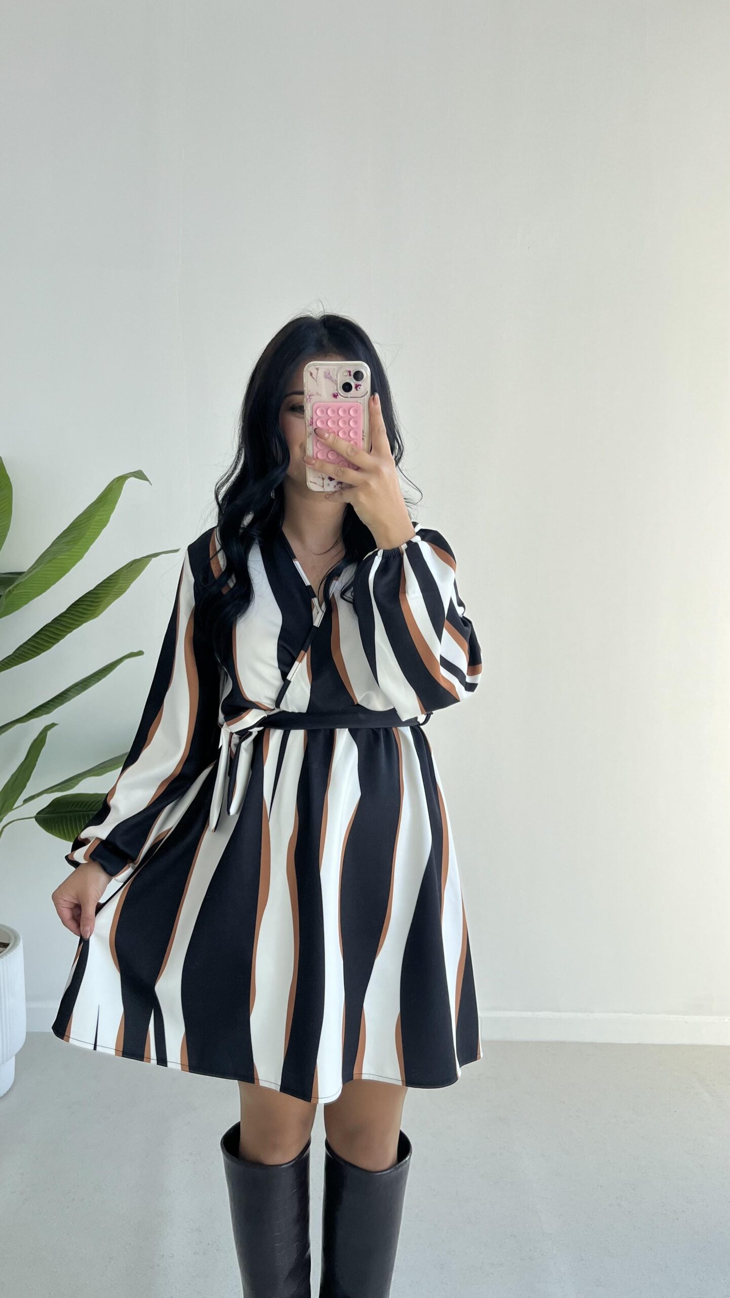 Kruvaze Yakalı Desenli Modal Mini Elbise – Füme