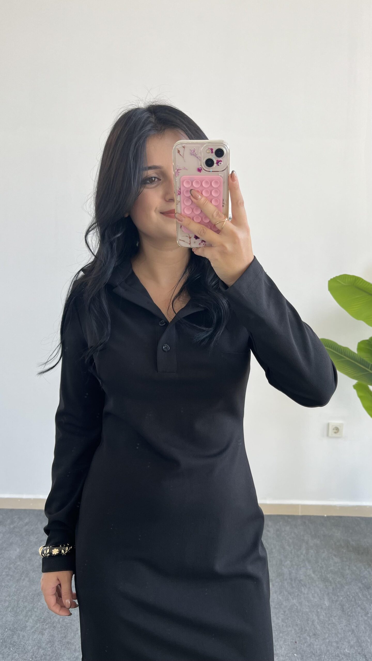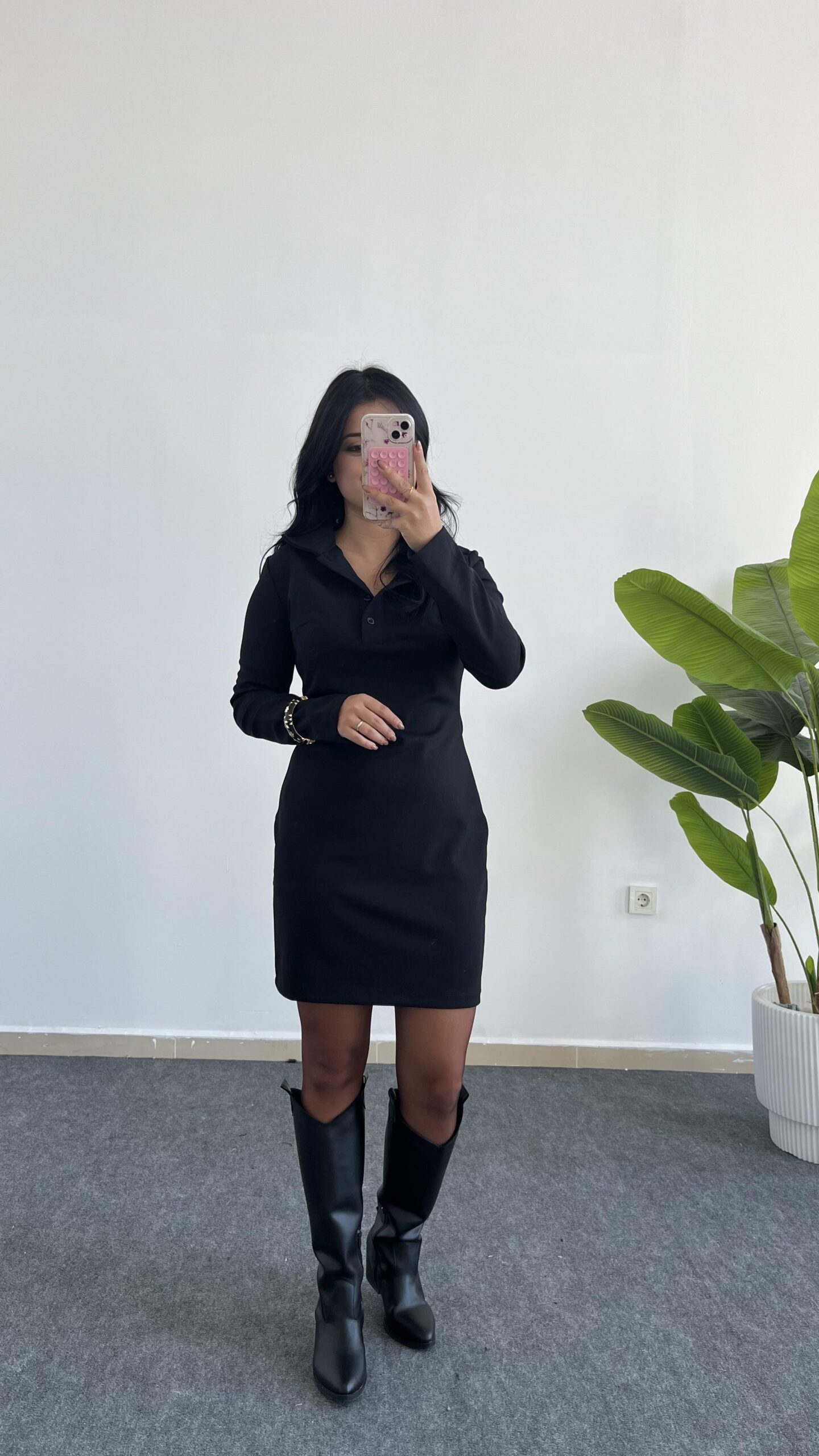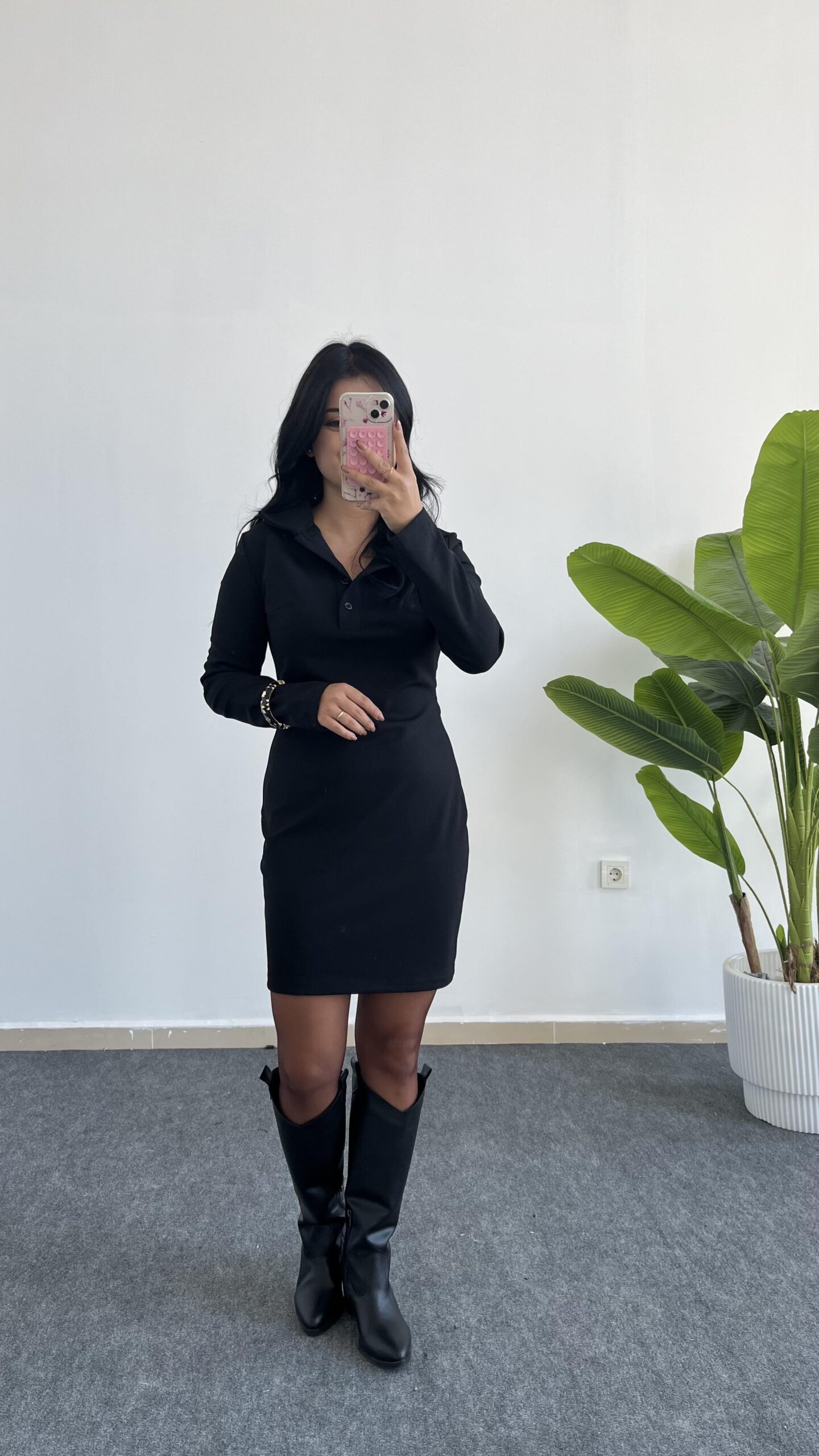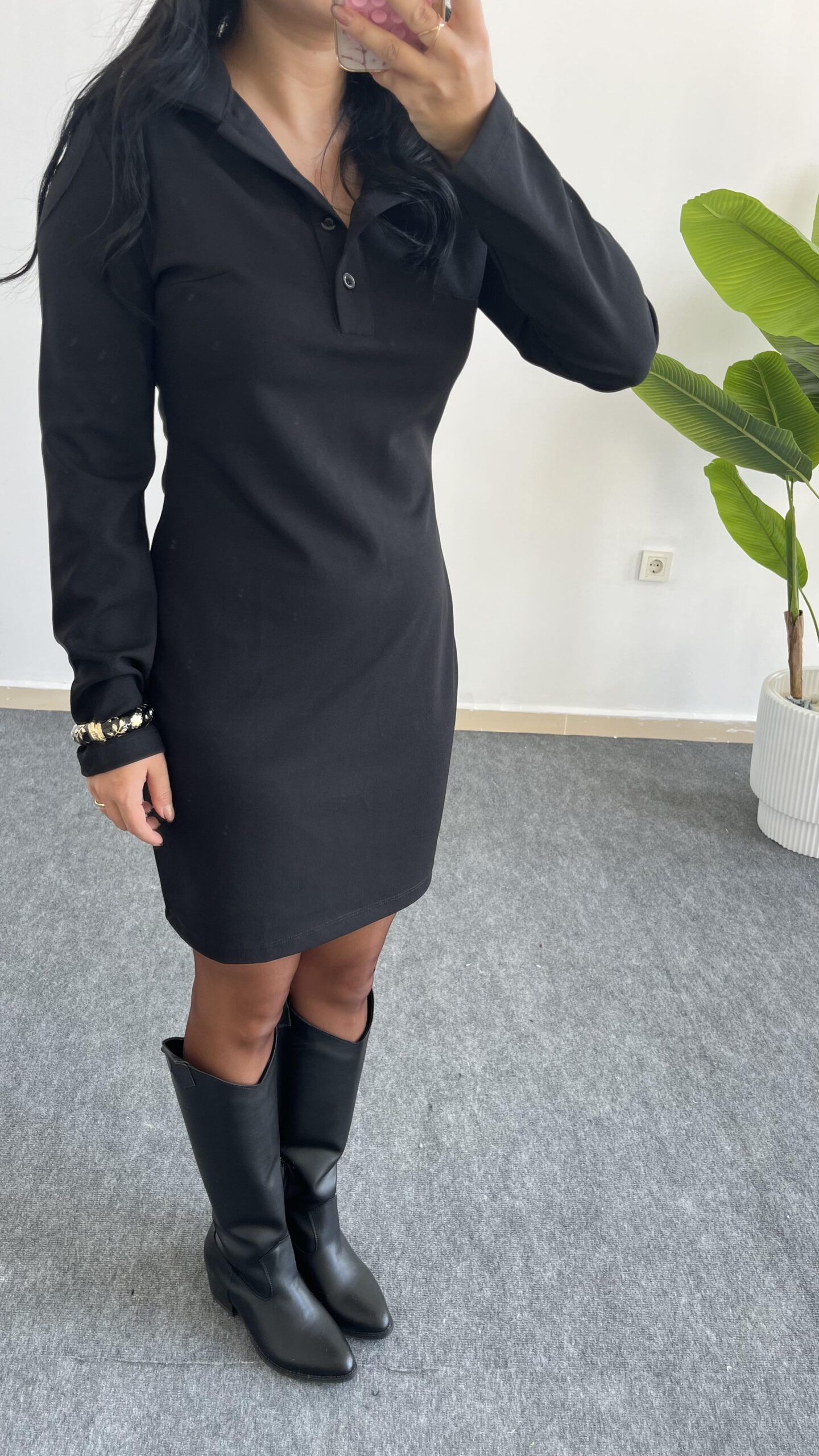 Polo Yaka Düğmeli Siyah Elbise