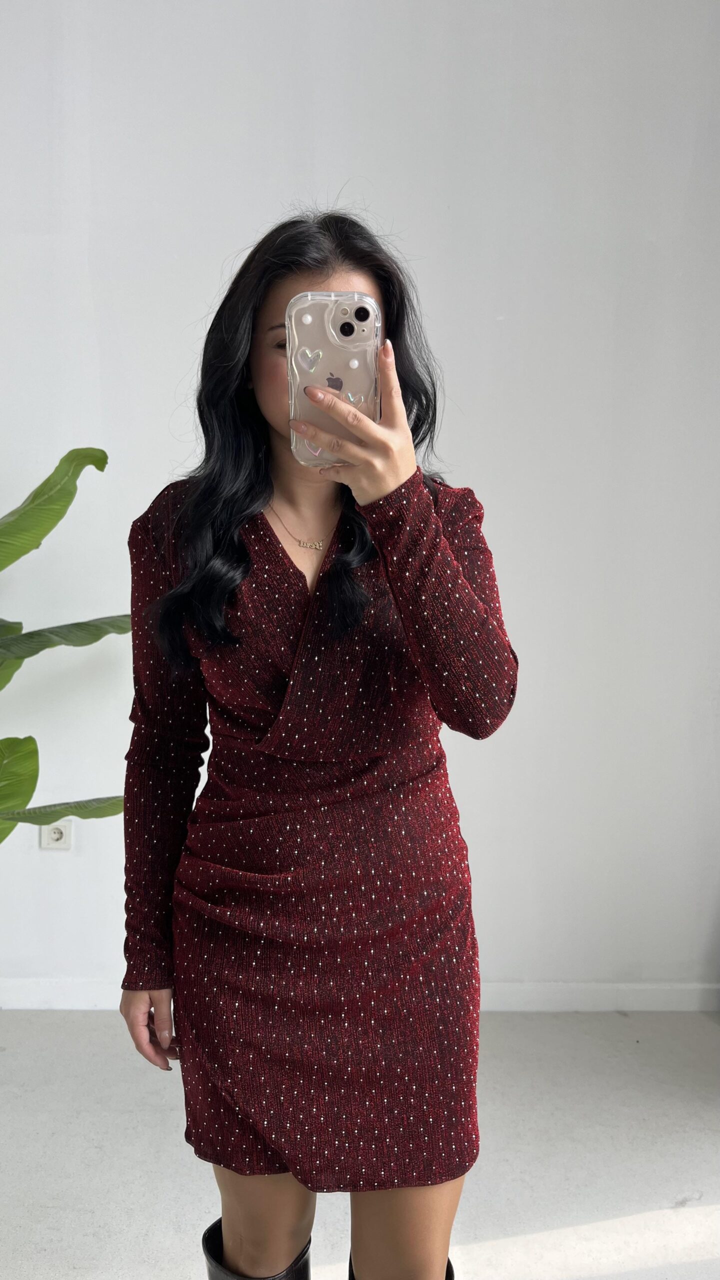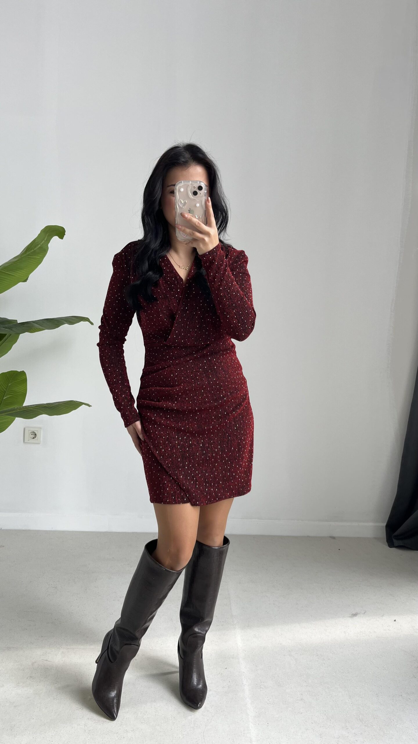 Simli Vatkalı Elbise – Bordo