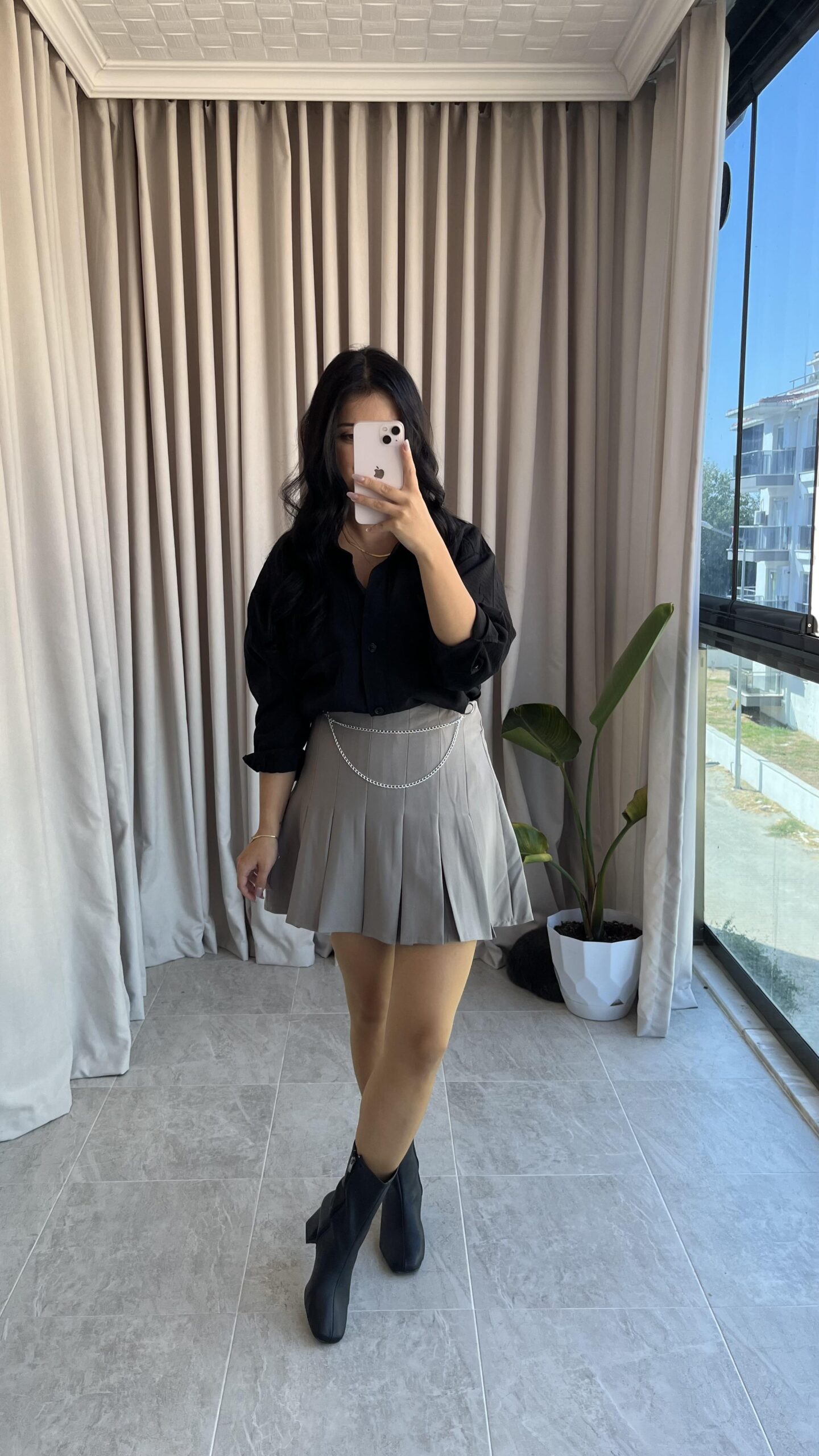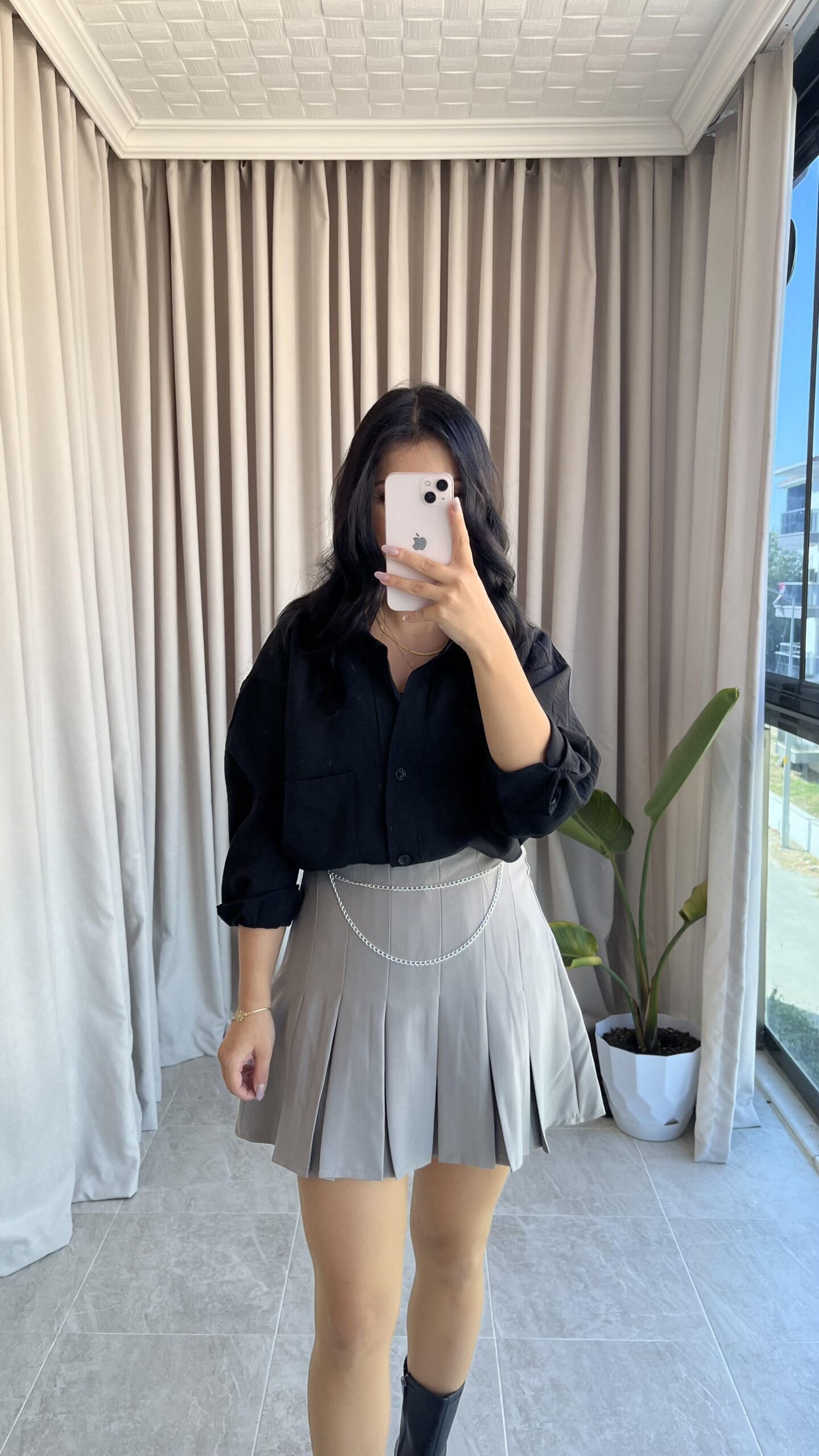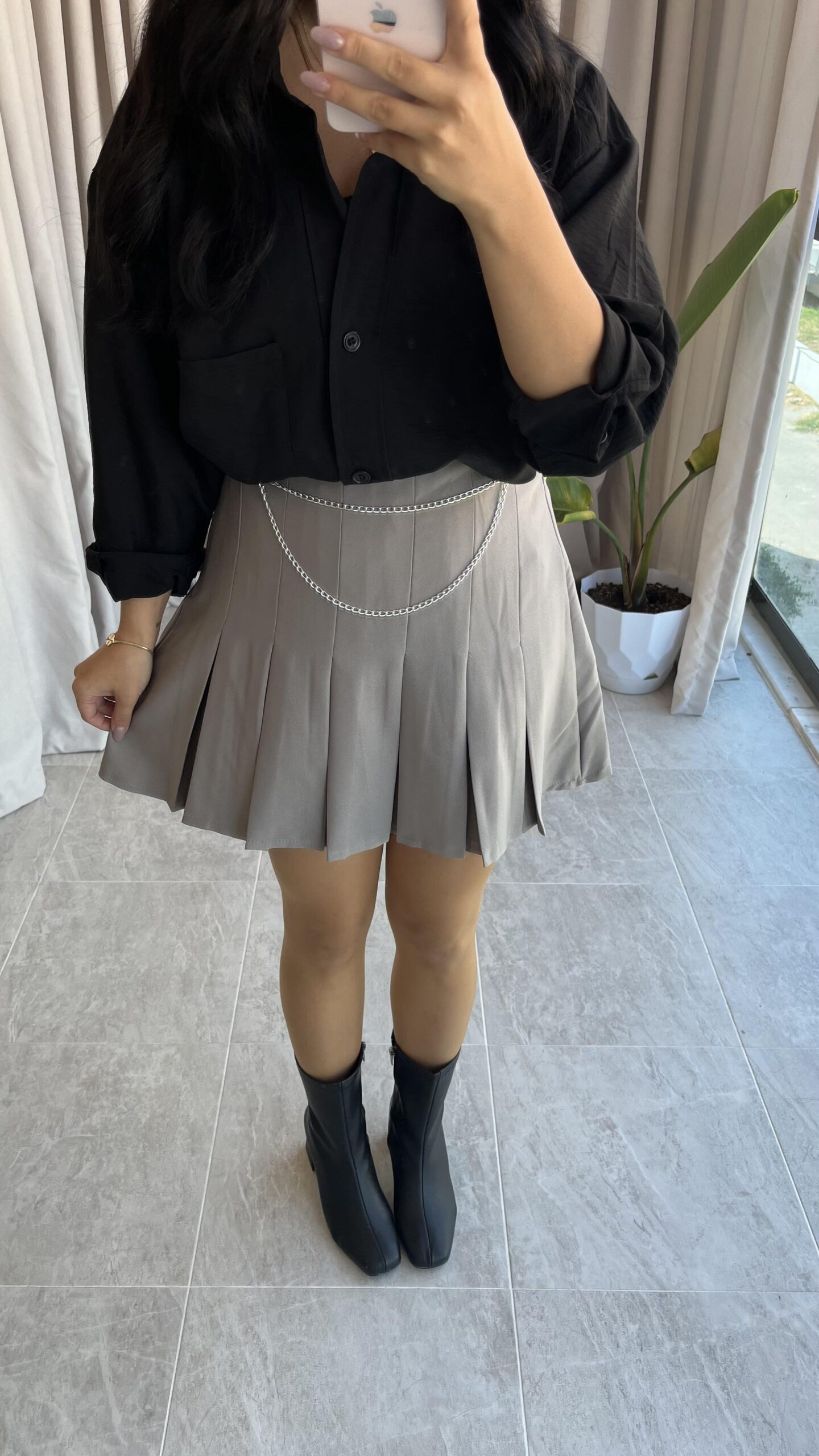 Ola Zincir Detaylı Gri Pileli Etek