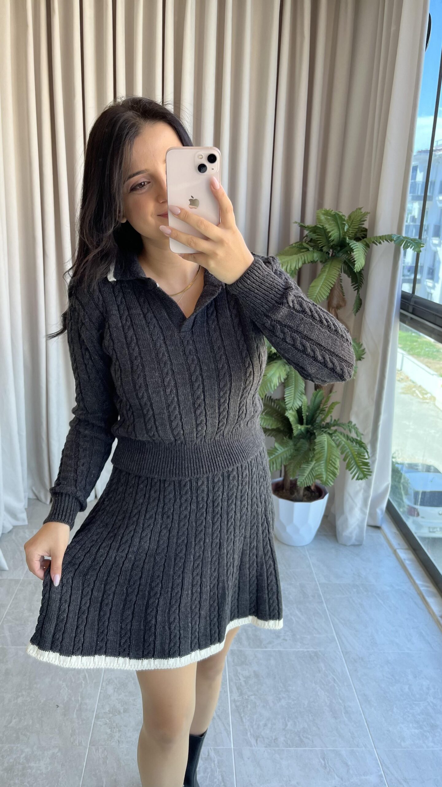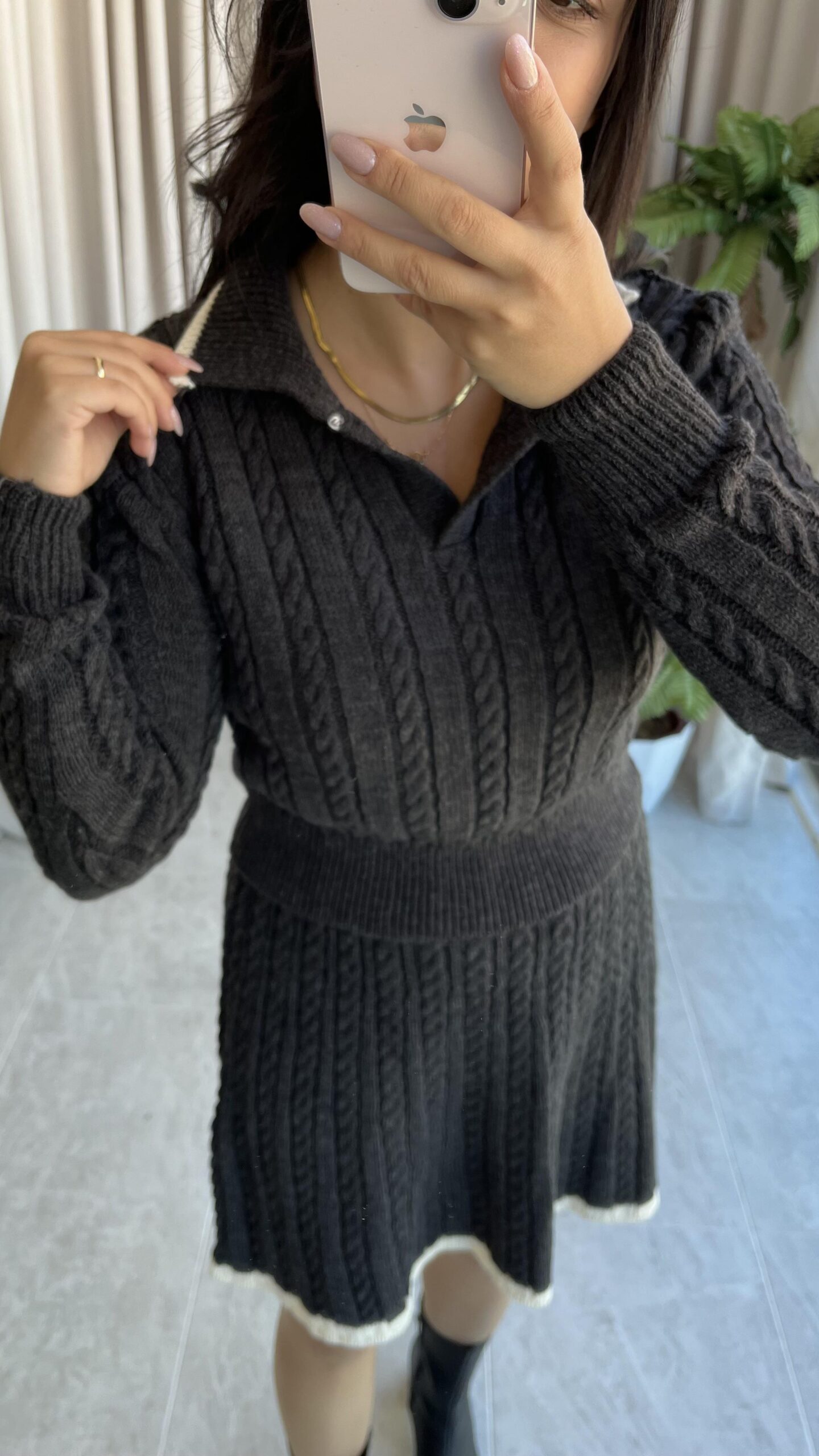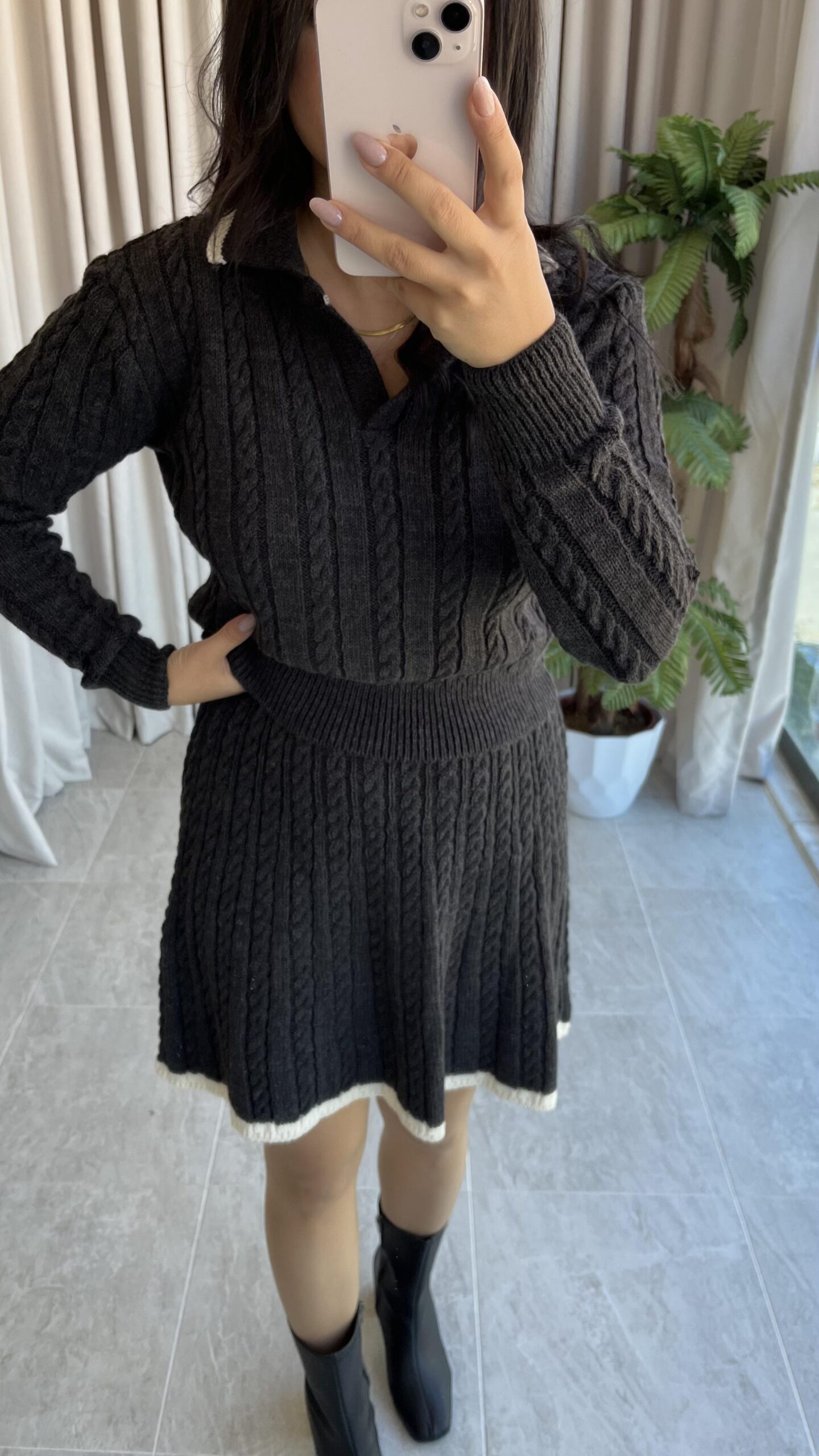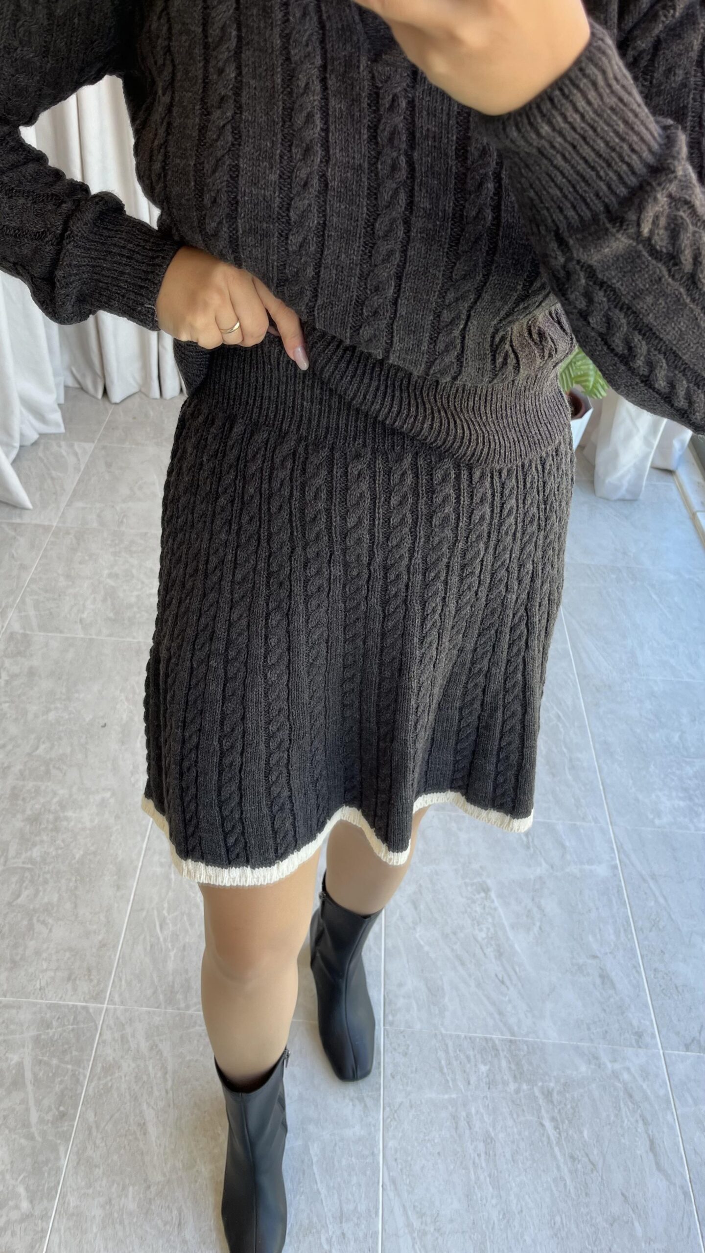 Antrasit Garnili Örgü Model Etek Kazak Takım