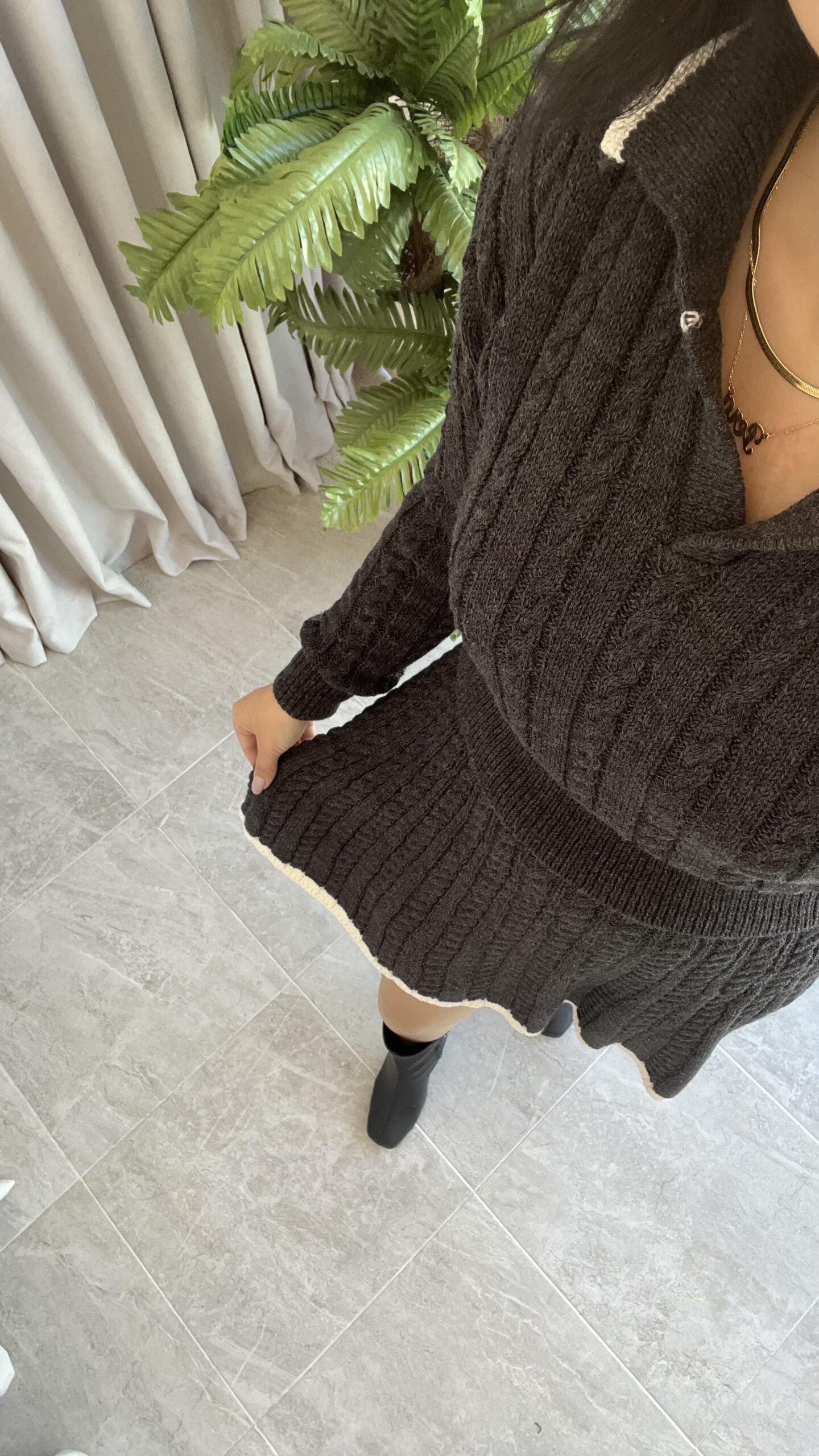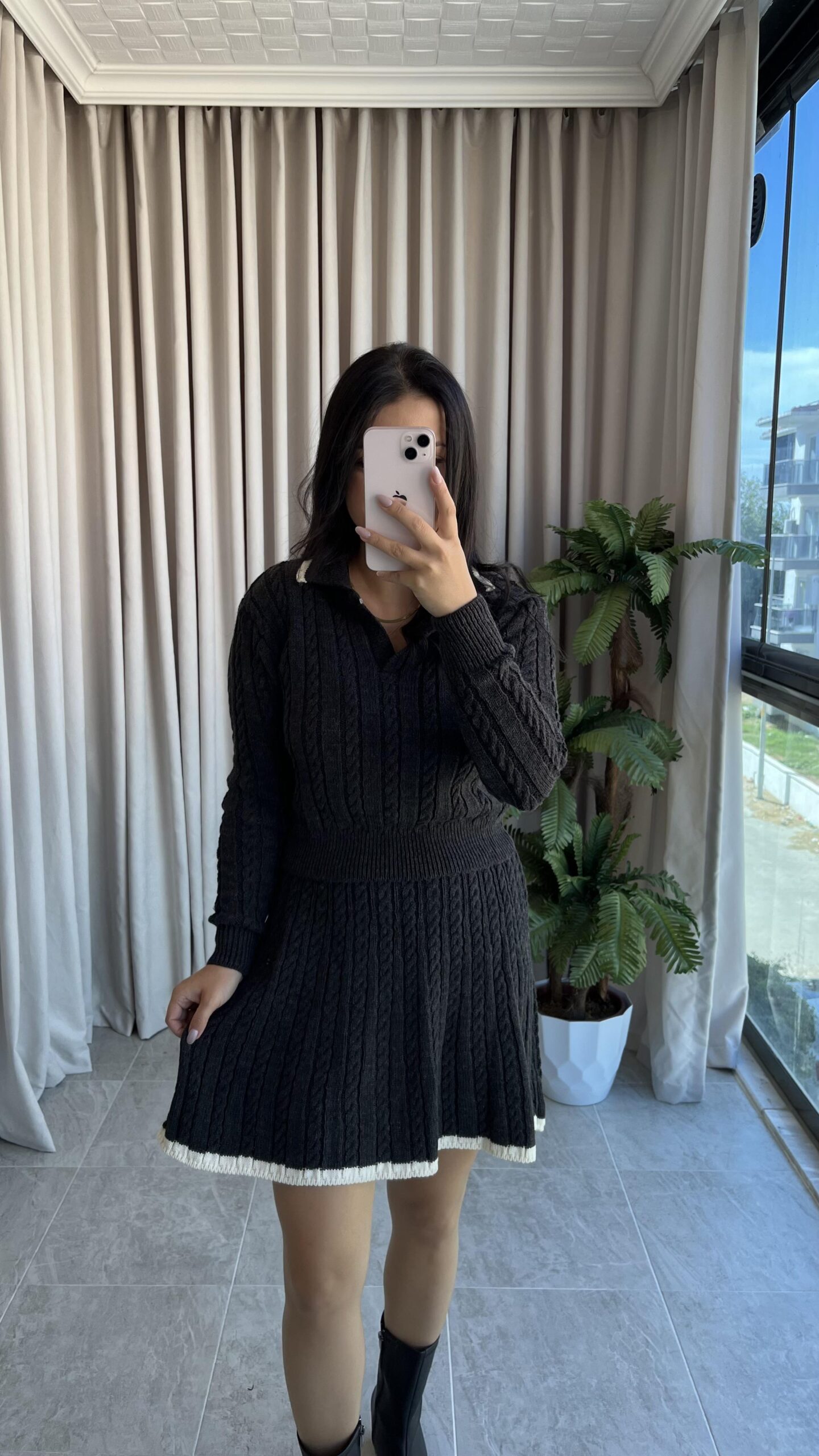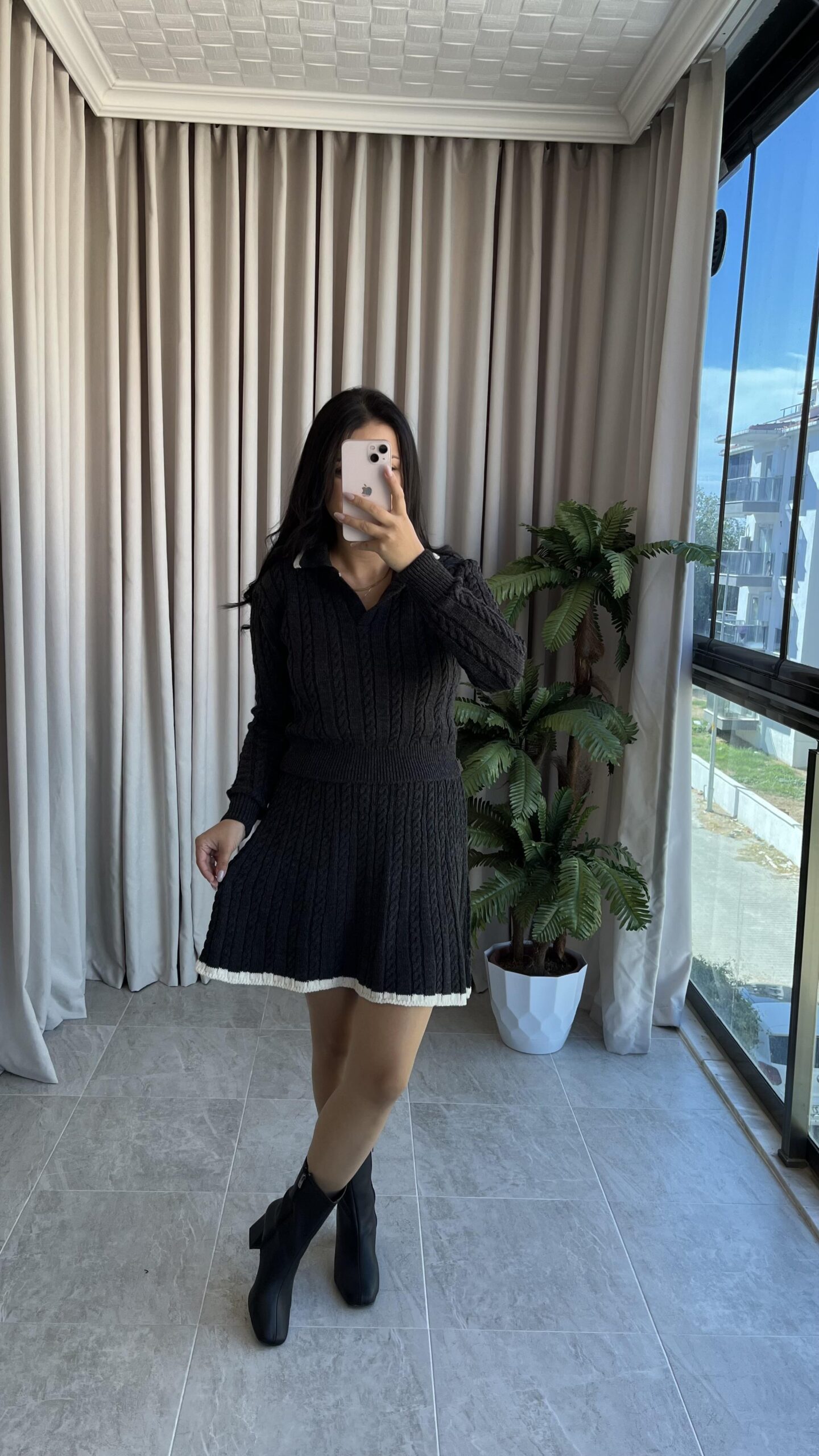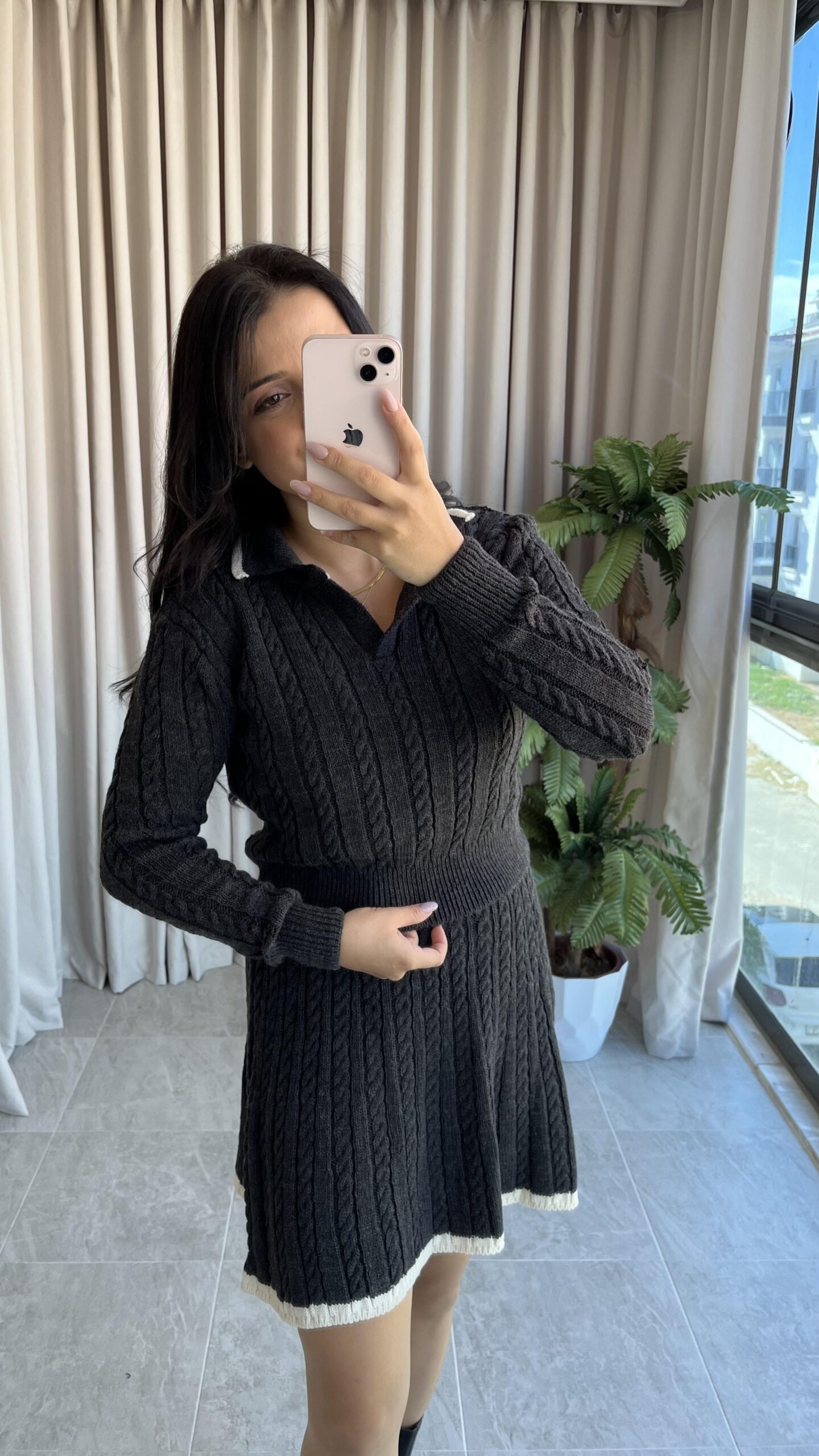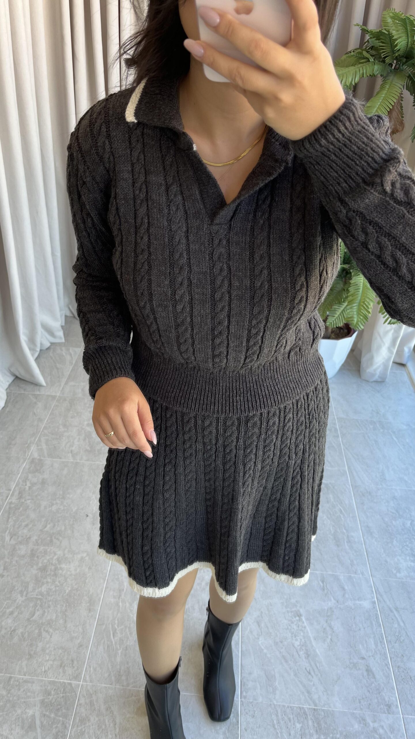 Antrasit Garnili Örgü Model Etek Kazak Takım